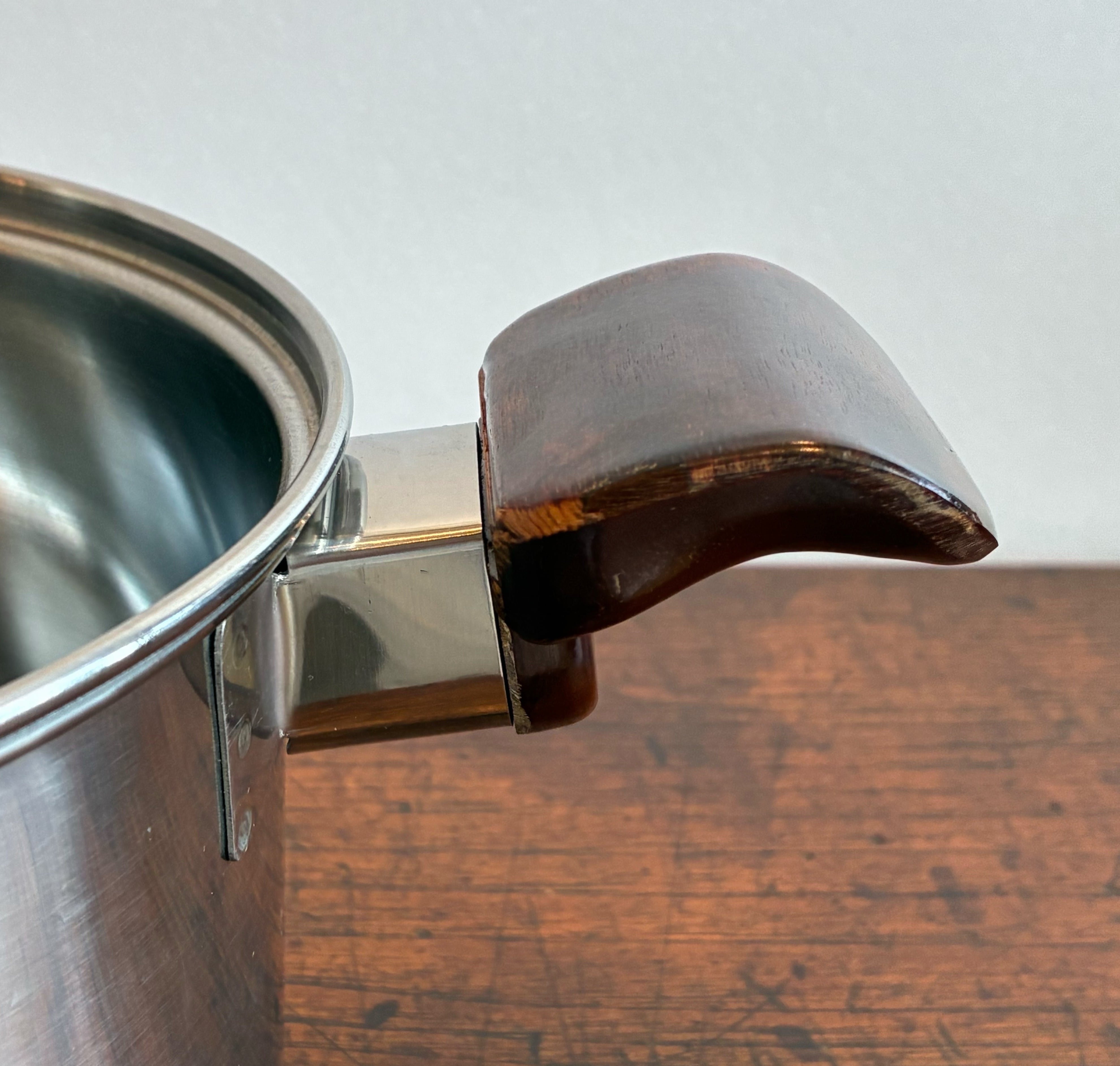 木製の持ち手と蓋ツマミと寸胴なフォルムがレトロで可愛いですね。