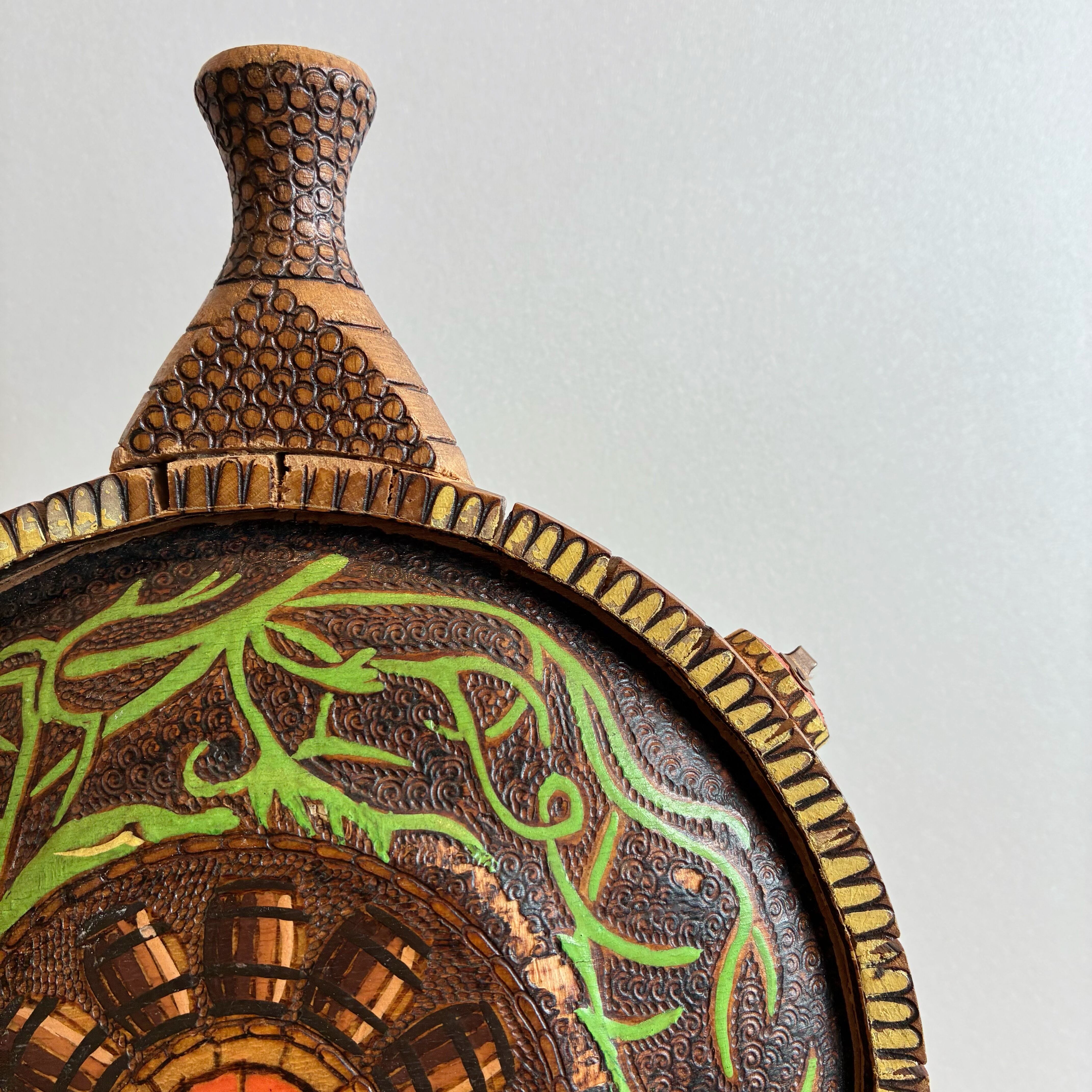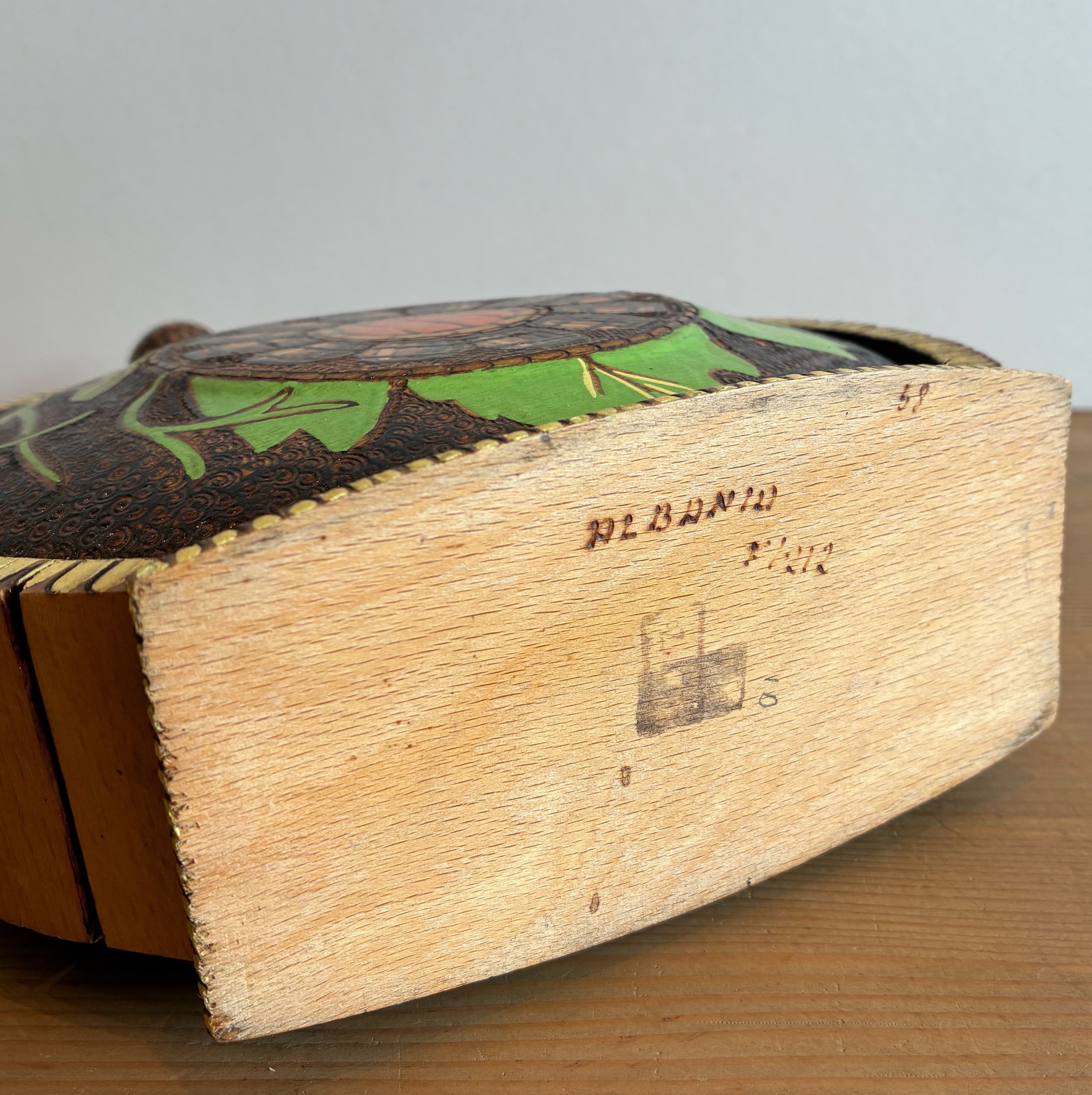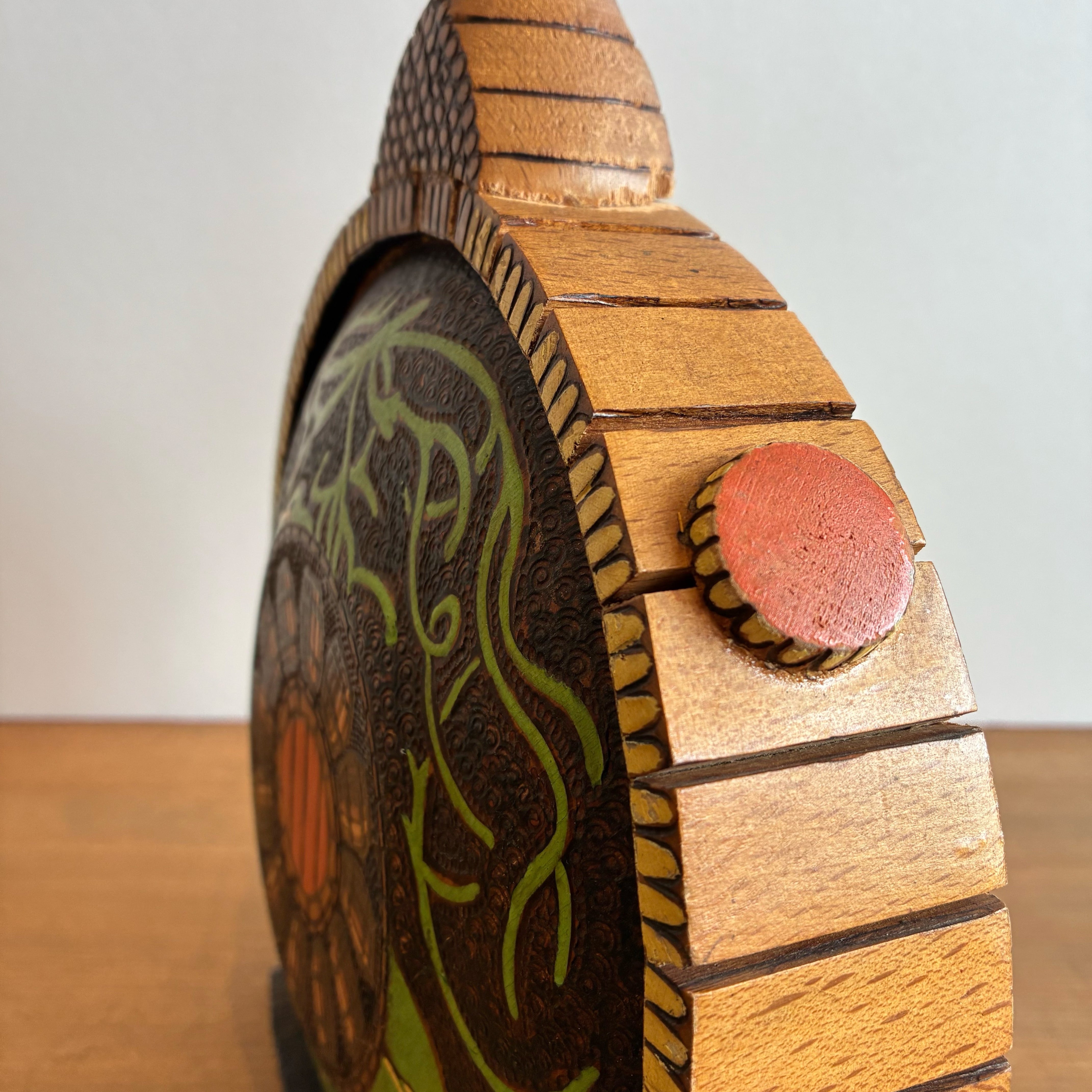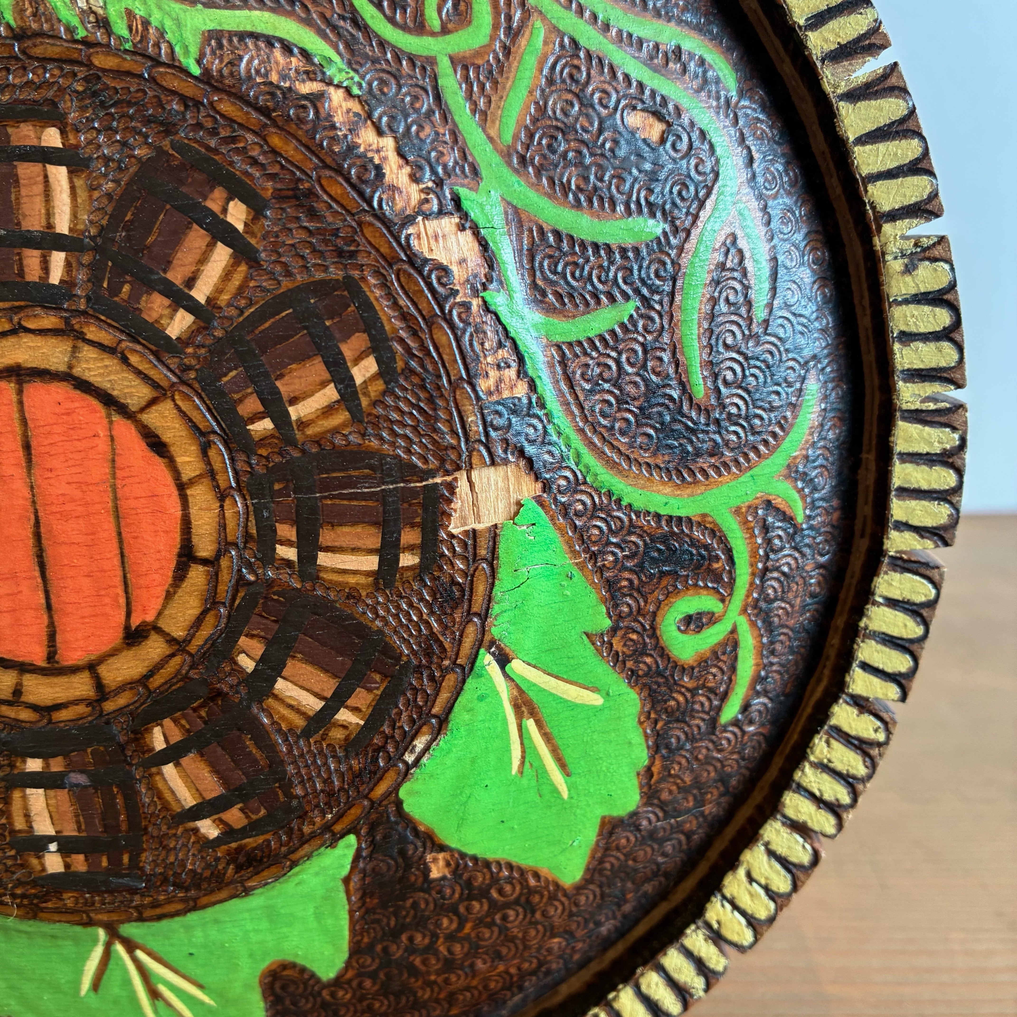 焼きゴテで描かれた細かい模様や、鮮やかなグリーンとオレンジの色使いも美しいですね。