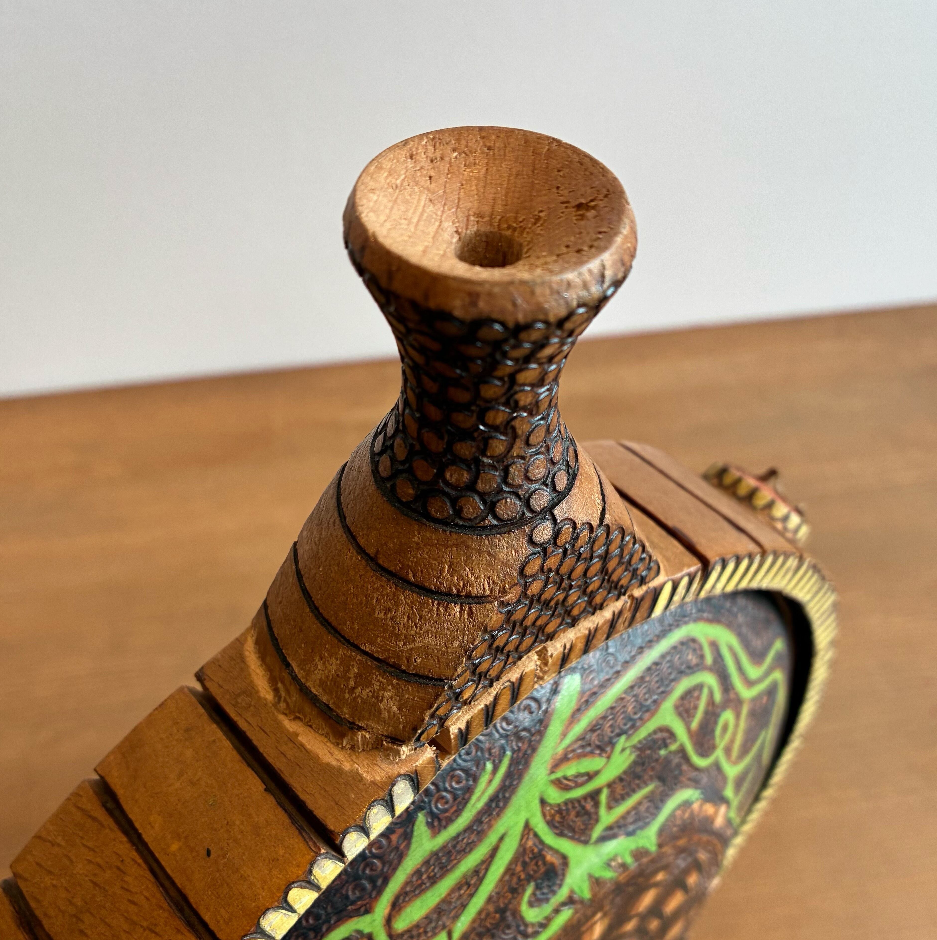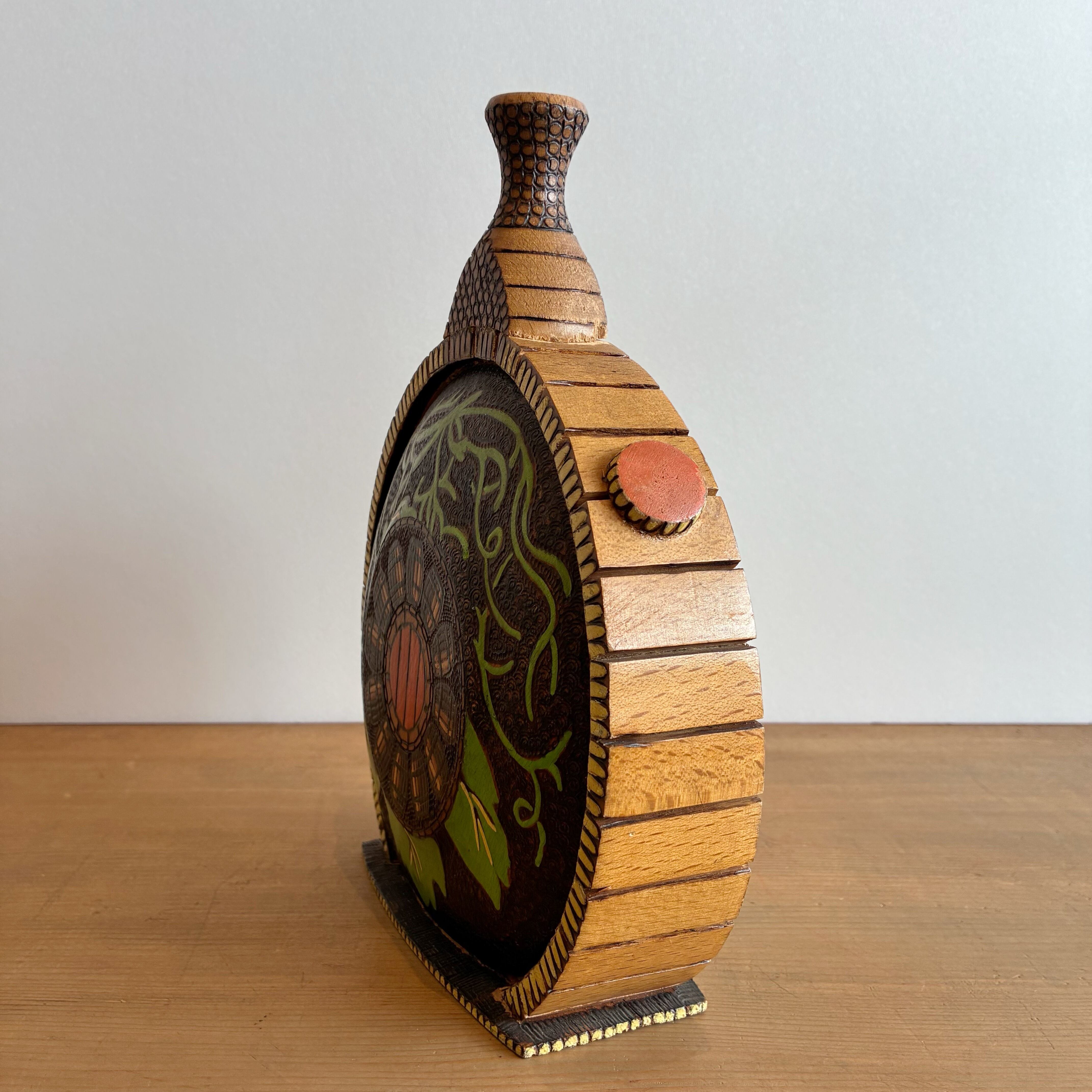 細部まで丁寧に木彫り彫刻された木製の水筒です。
