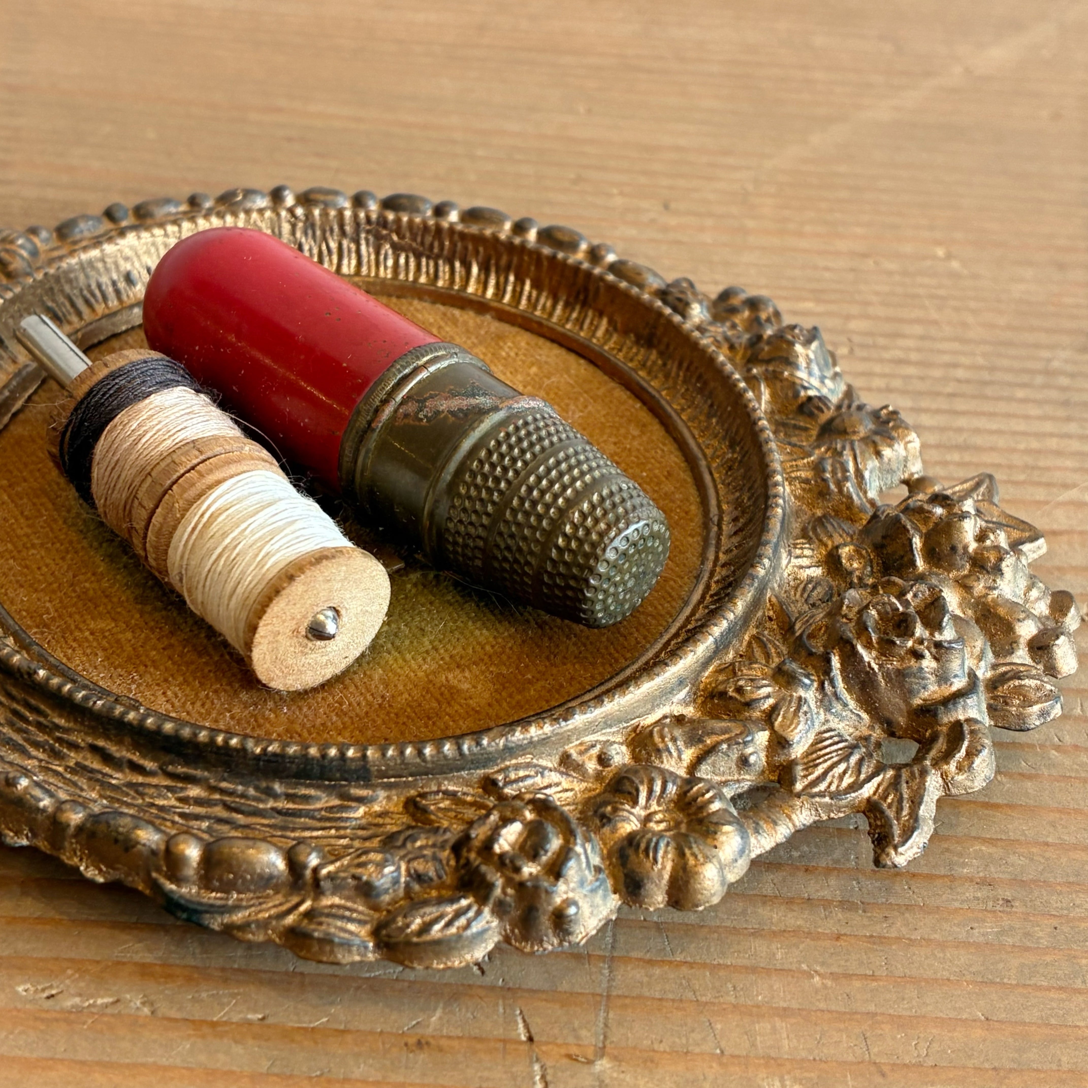 アンティークのソーイングキットを雰囲気あるミニフレームで額装したユニークな作品です。
