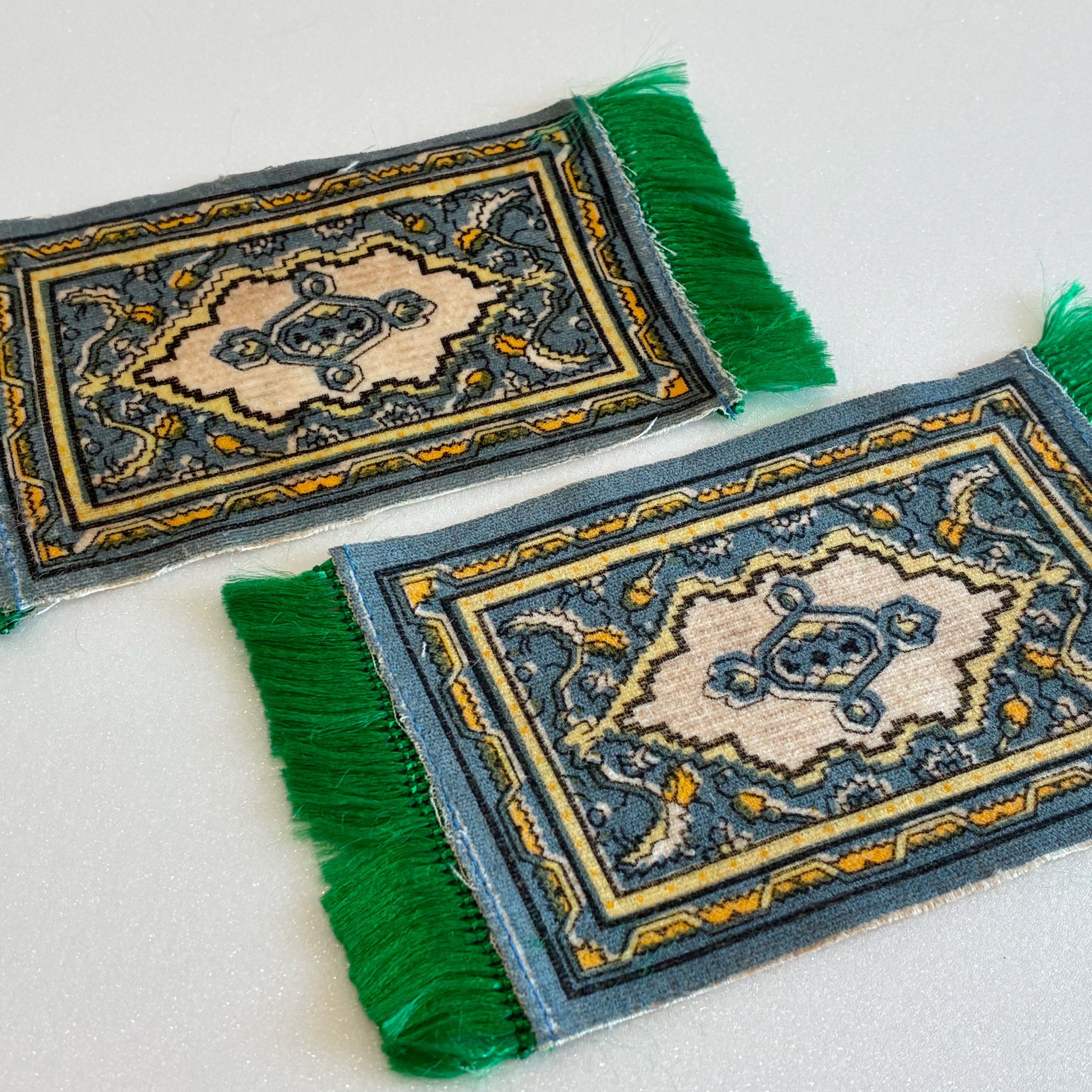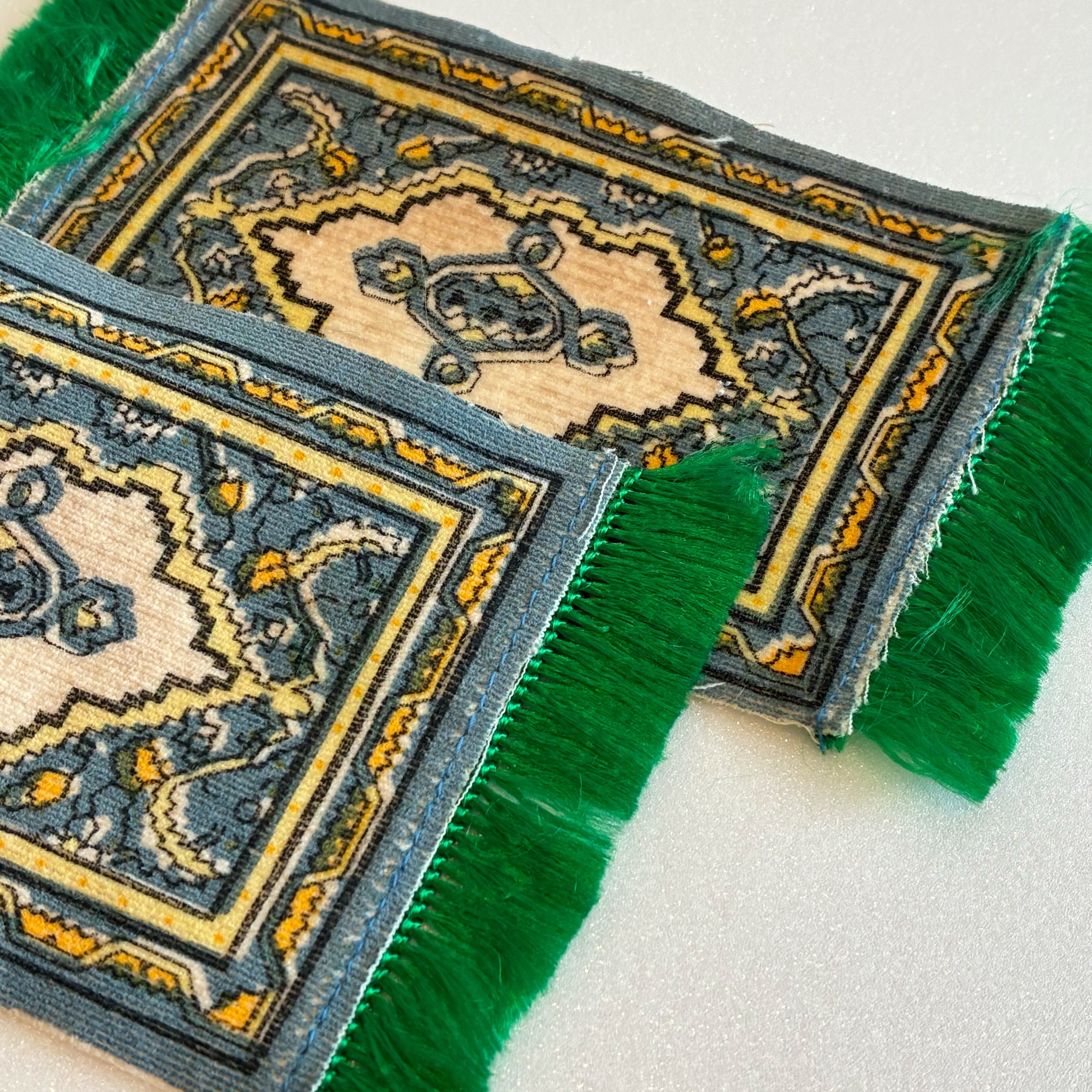 鮮やかなグリーンのフリンジとペルシャ風デザインがミニサイズながらもオシャレな絨毯です。