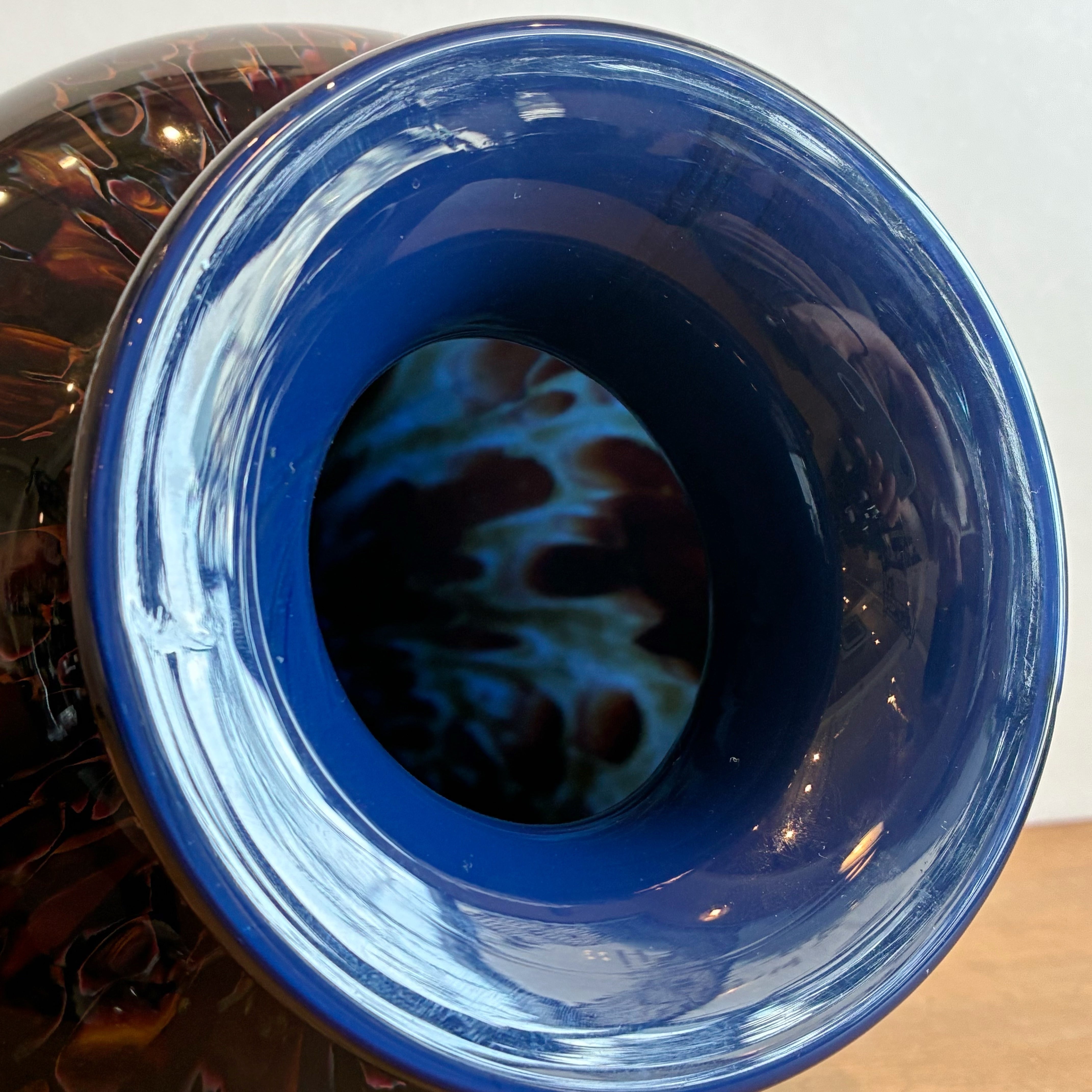 落ち着いた色合いのマーブルガラスと口部分のブルーの配色がシンプルながらも目を引くデザインです。お花を生けなくても、そのまま飾っても素敵ですよ。
