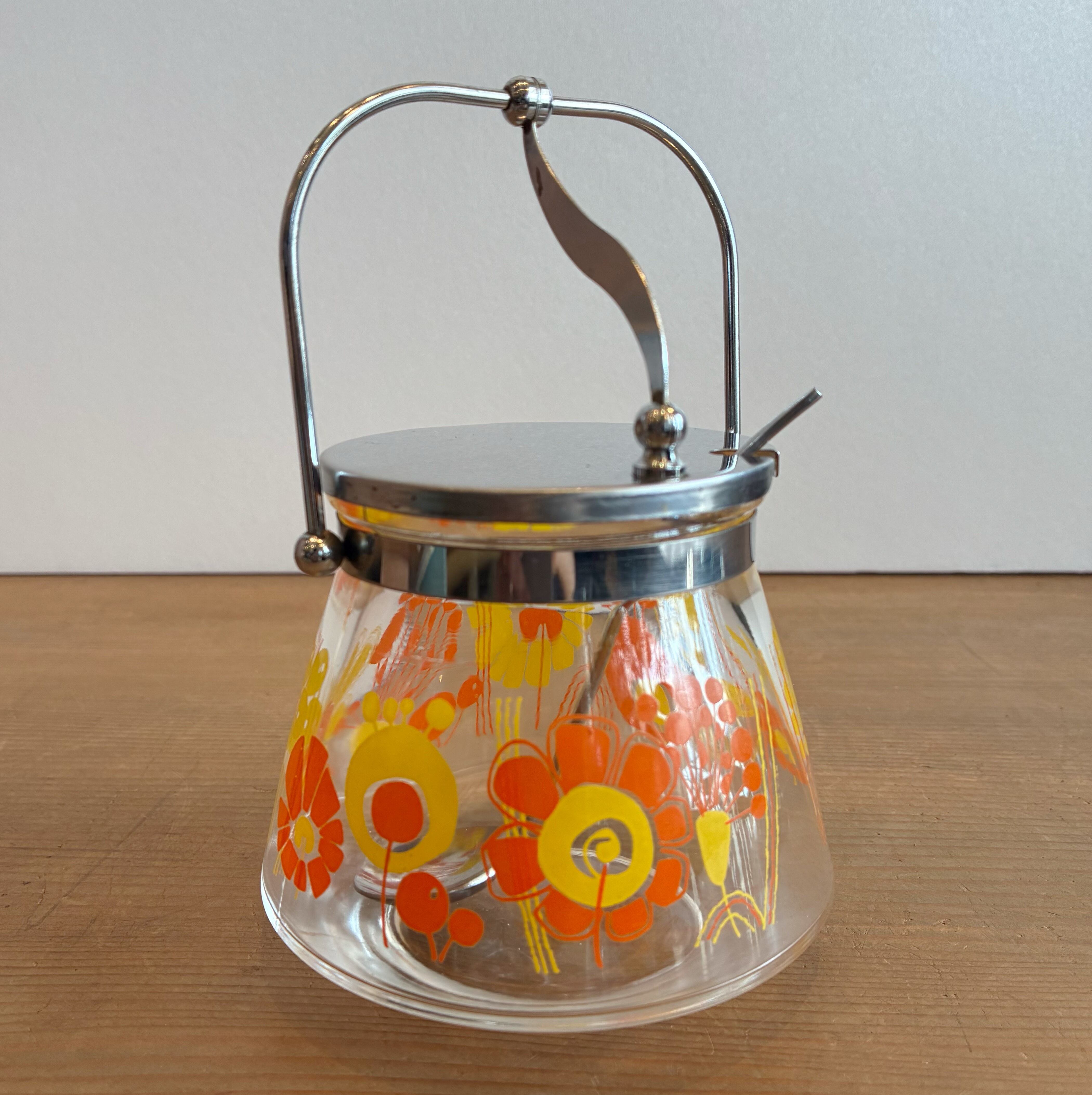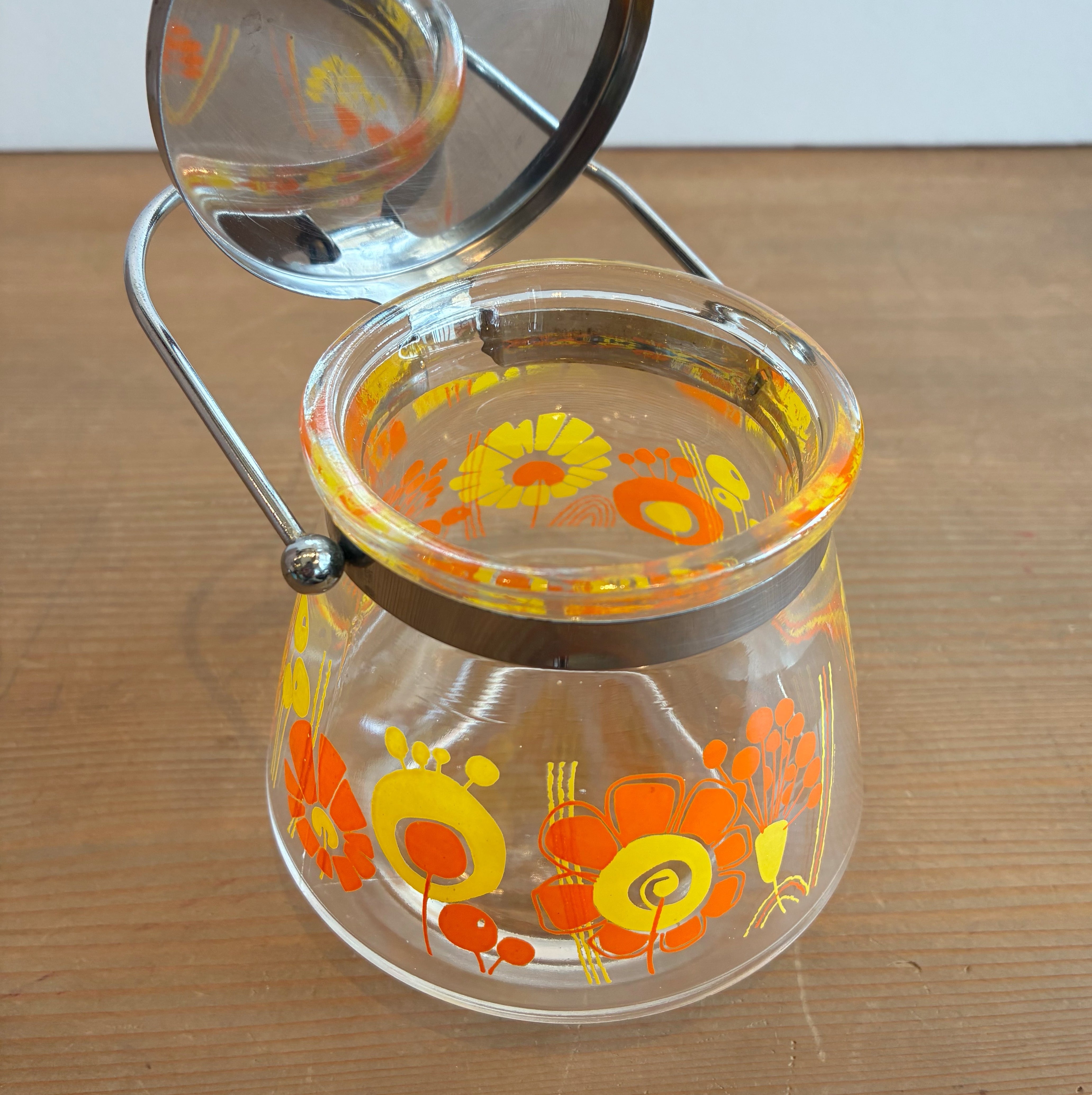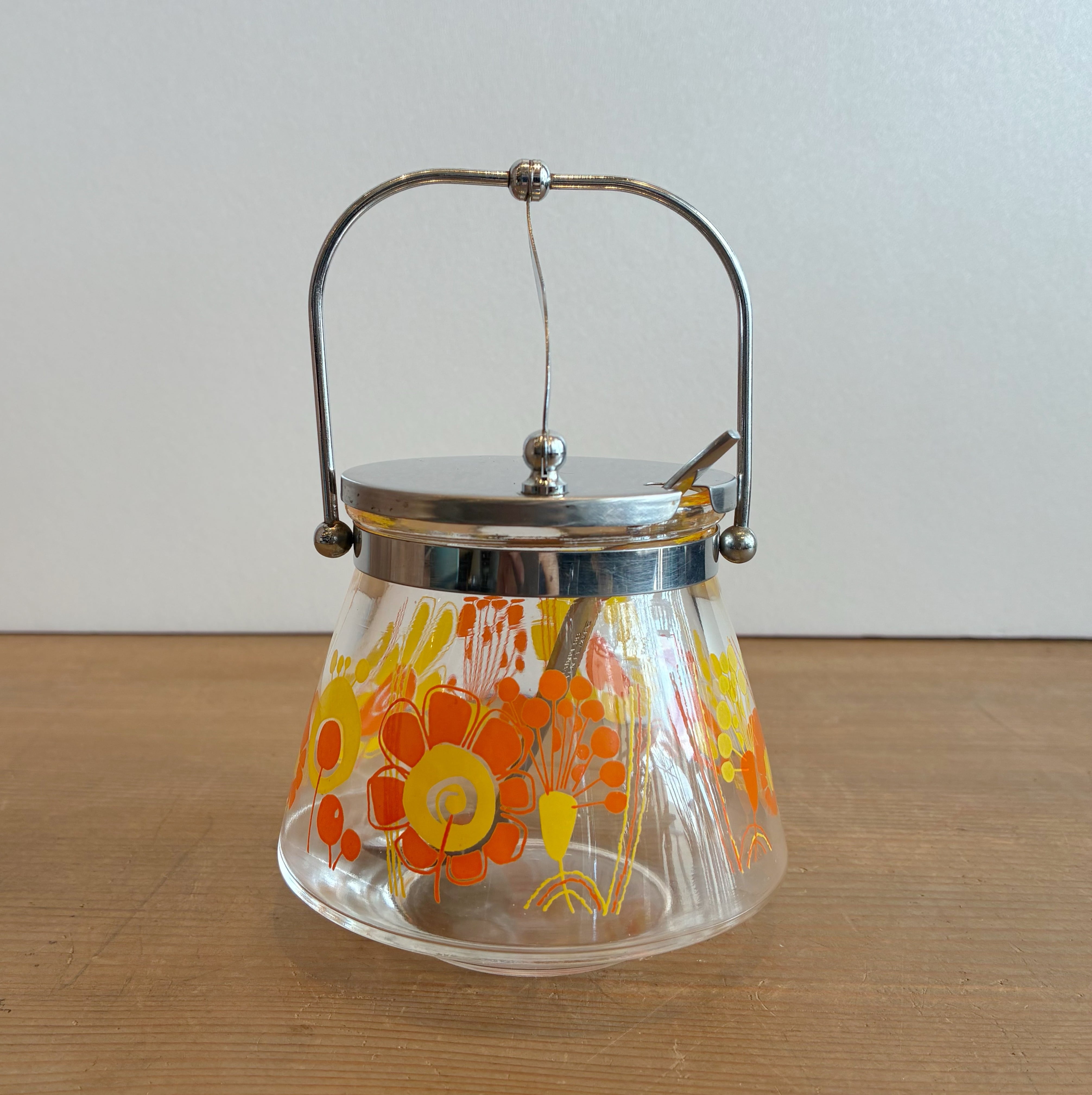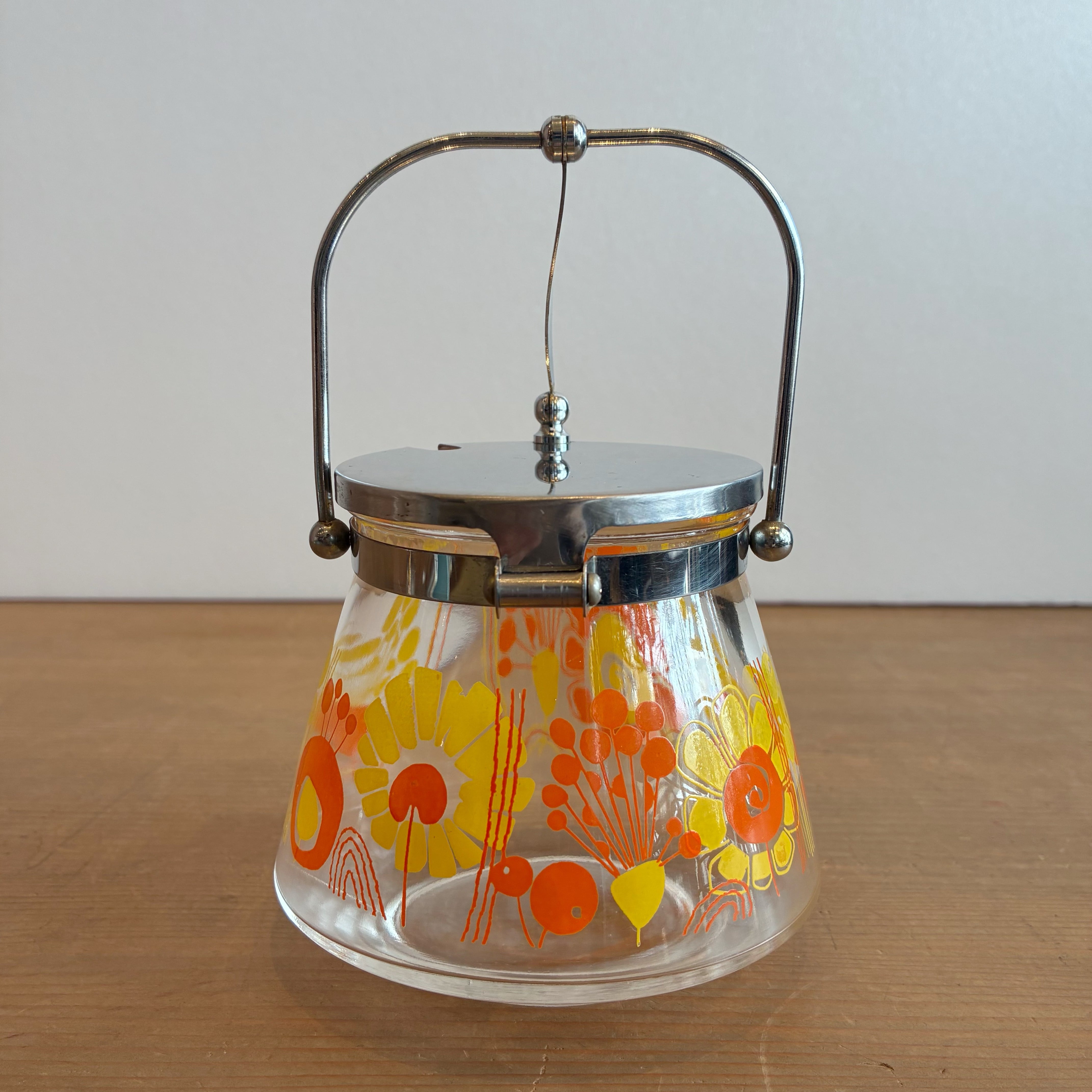 オレンジとイエローの花柄がレトロなシュガーポット。