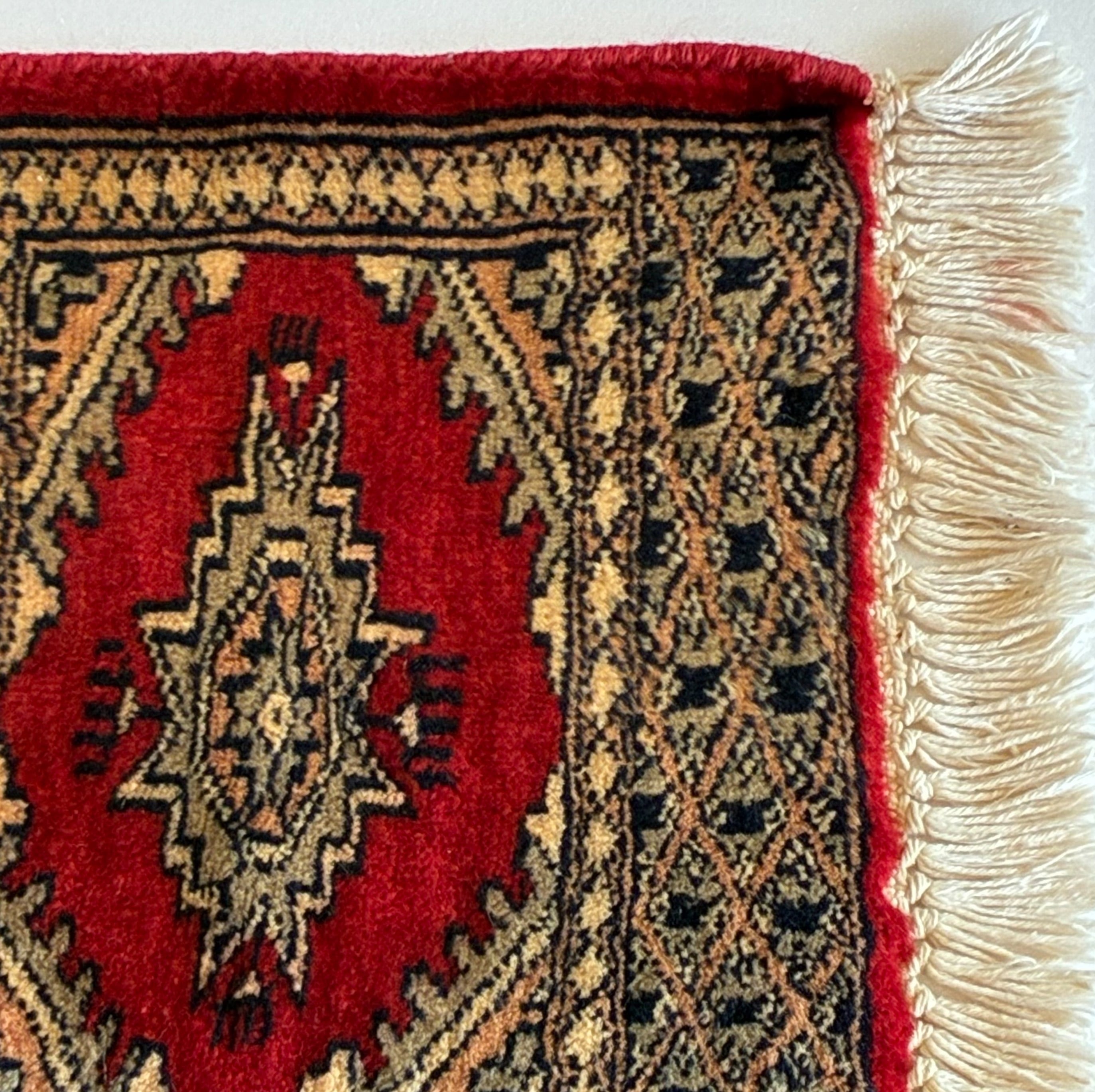 長めのフリンジと鮮やかな赤、トライバルラグらしい紋様がかっこいい一枚です。