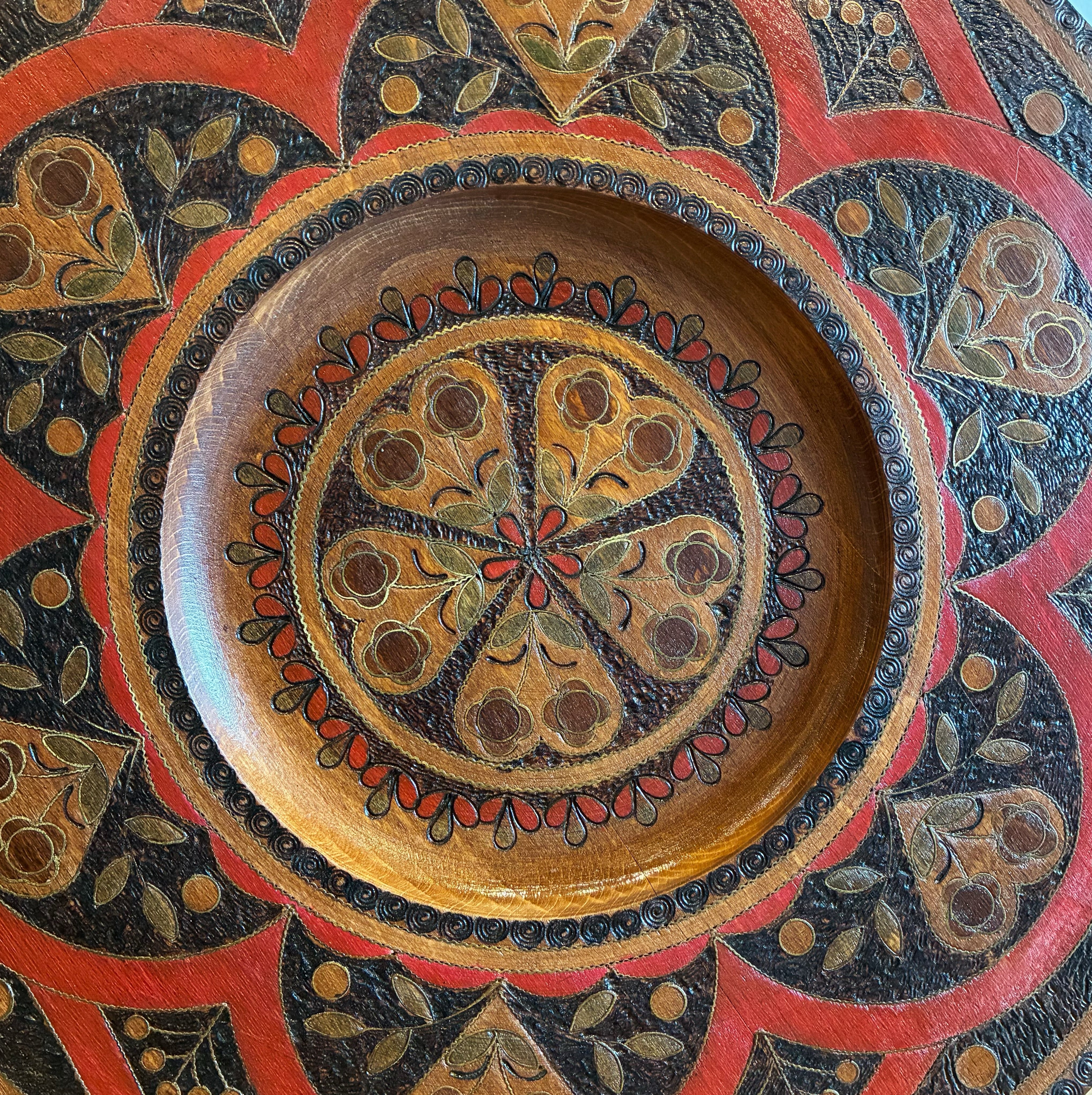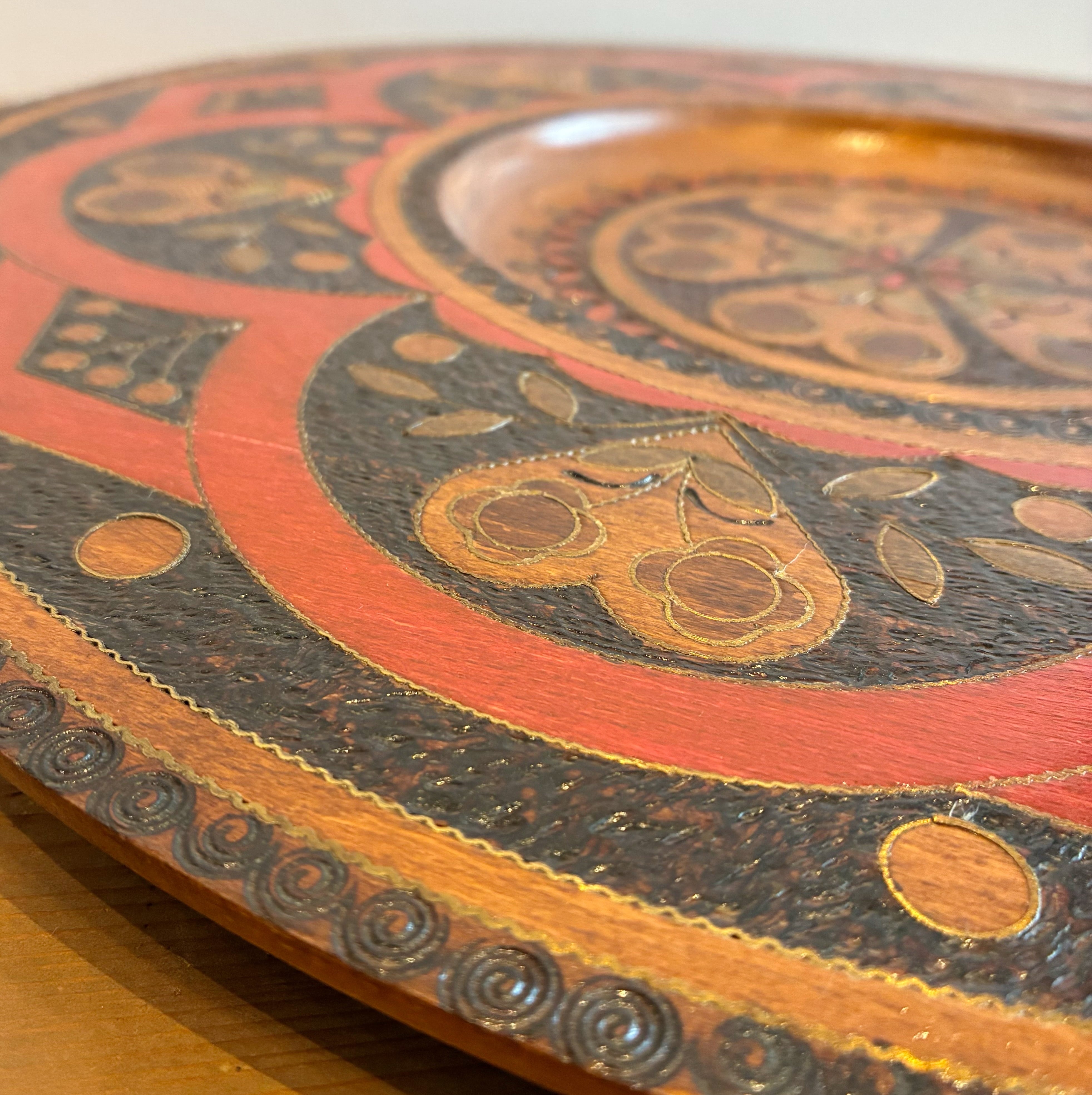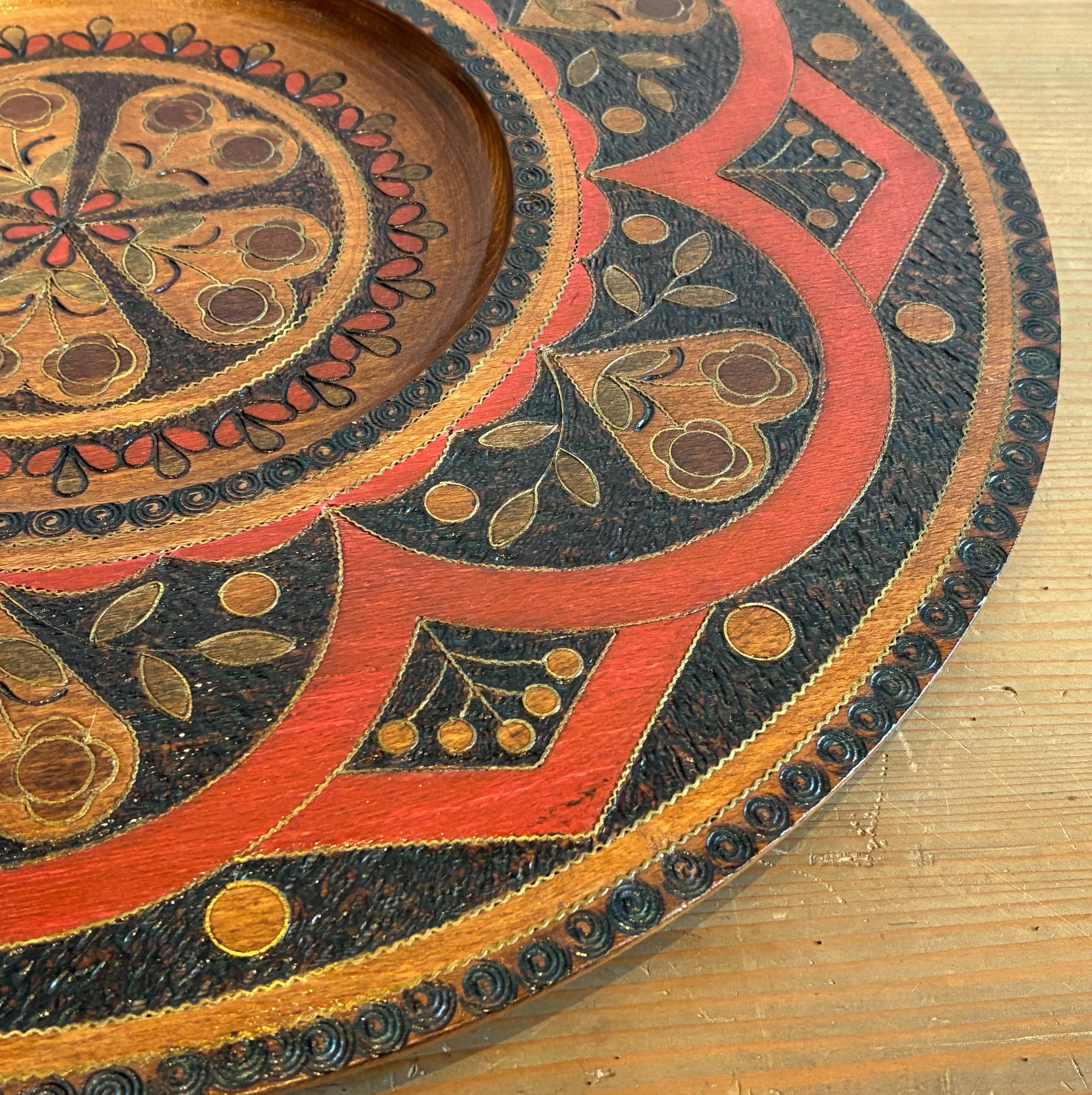焼きゴテで描かれた縁の渦巻模様や花柄が可愛らしく、壁によく映えそうなデザインです。