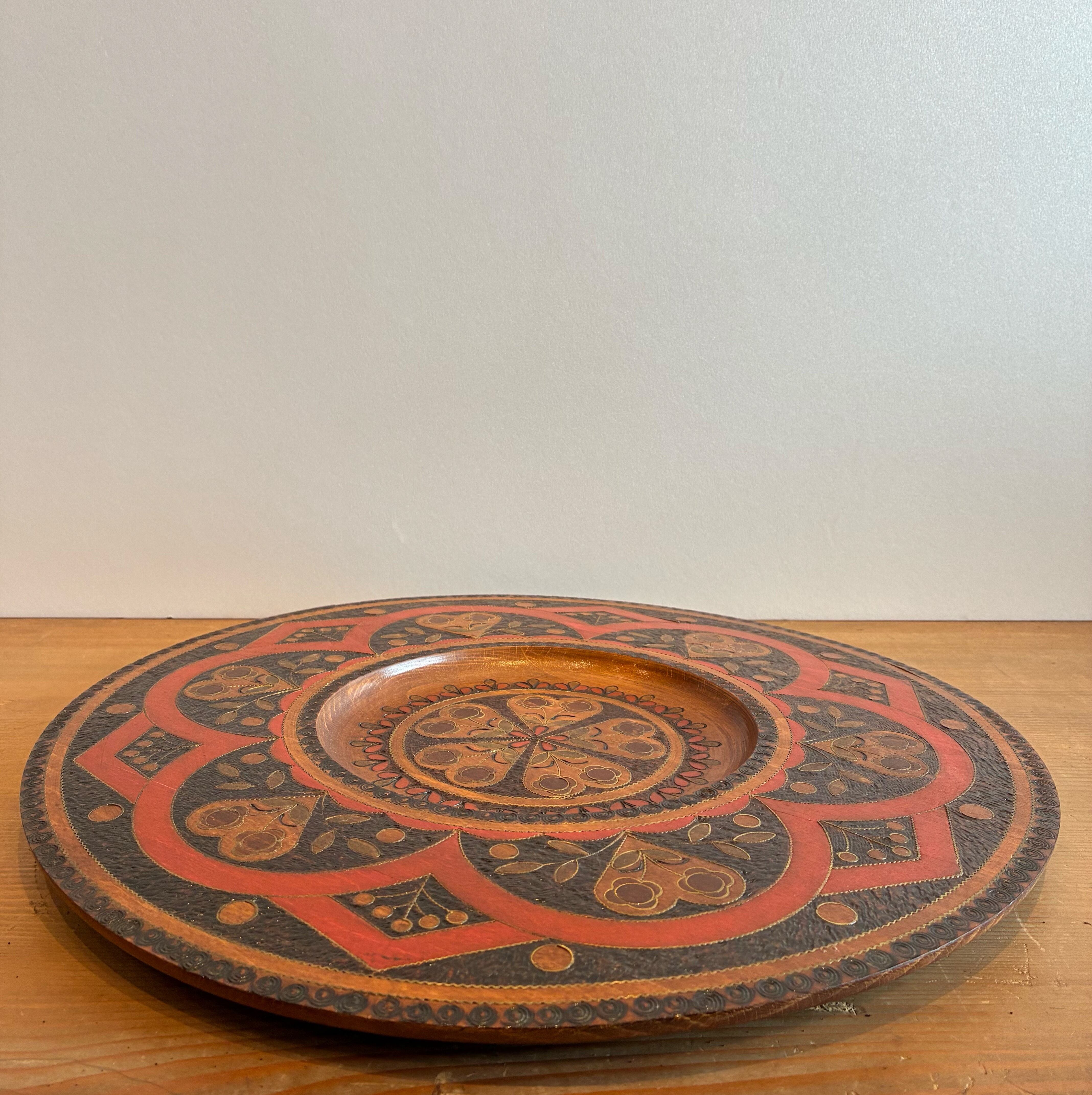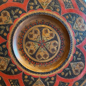 くり抜きの木皿に、細部まで丁寧に施された木彫りと象嵌細工が美しい一品です。