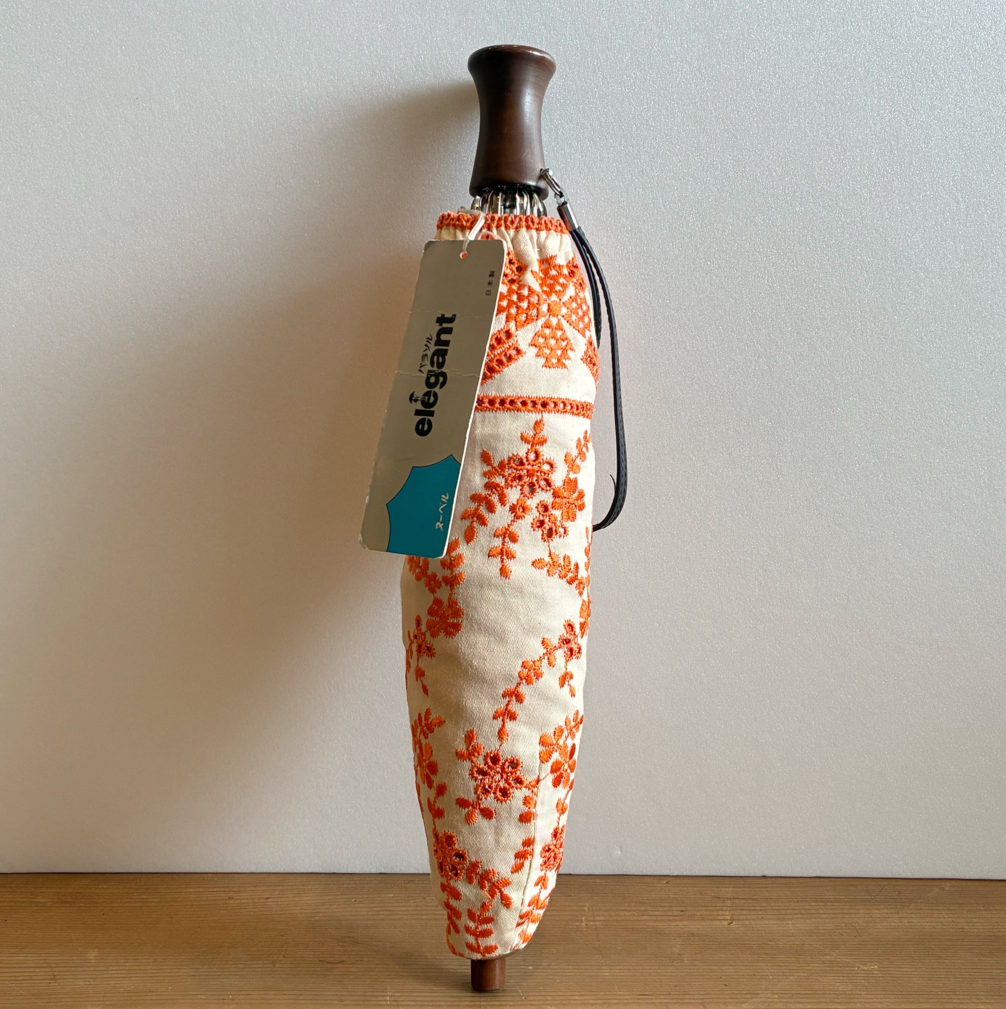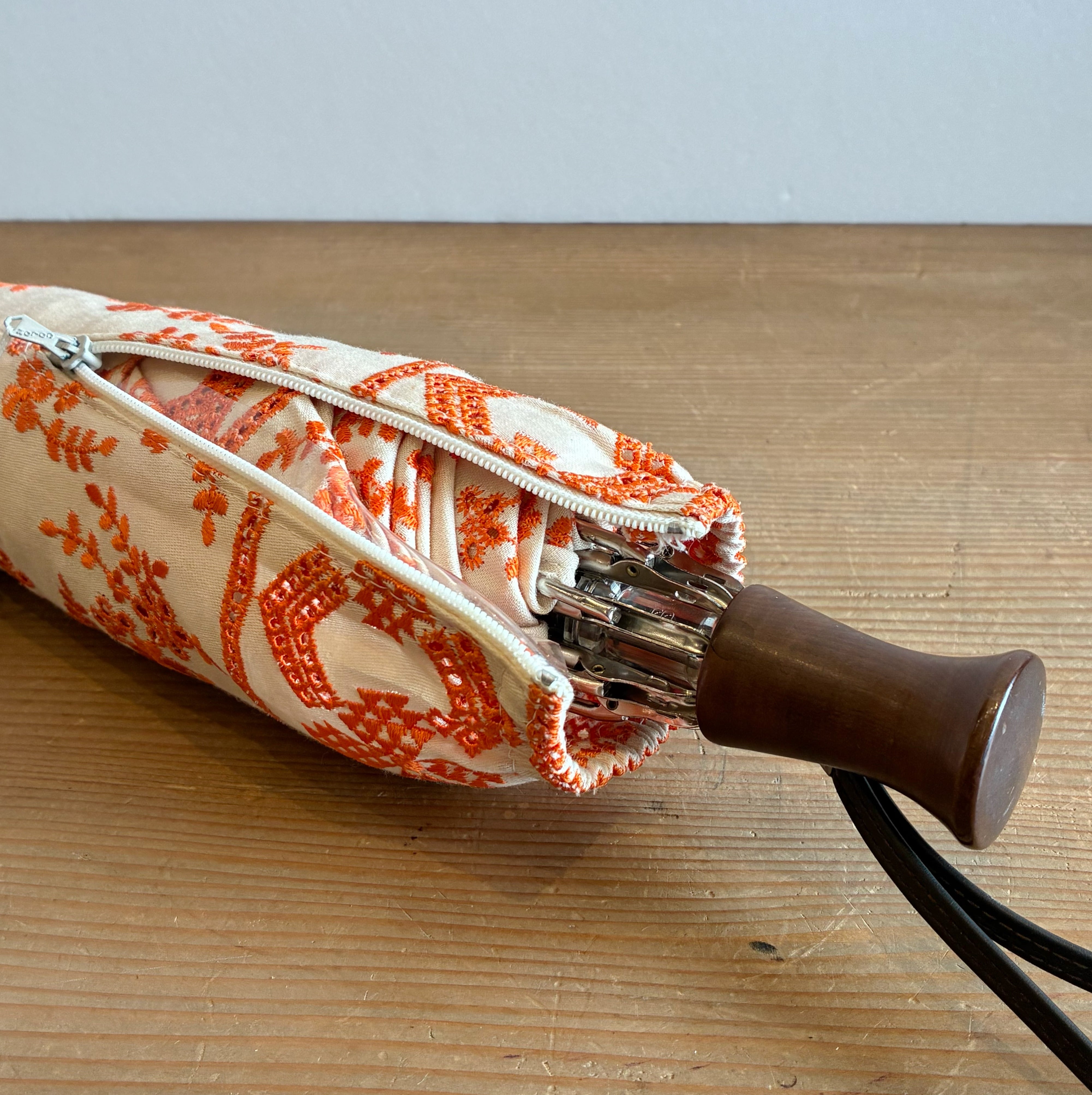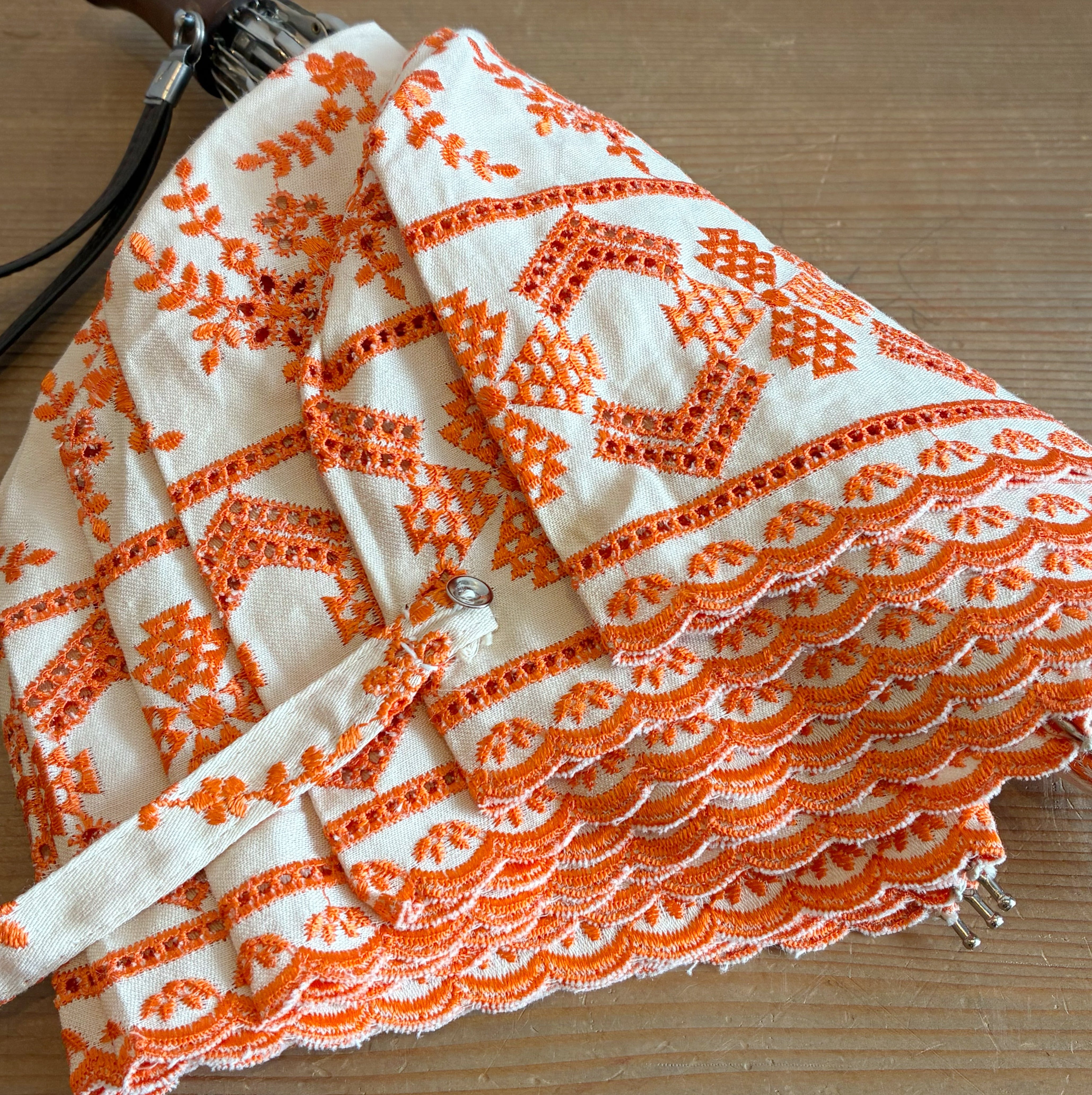 オレンジの総刺繍がレトロで可愛い折り畳み日傘。