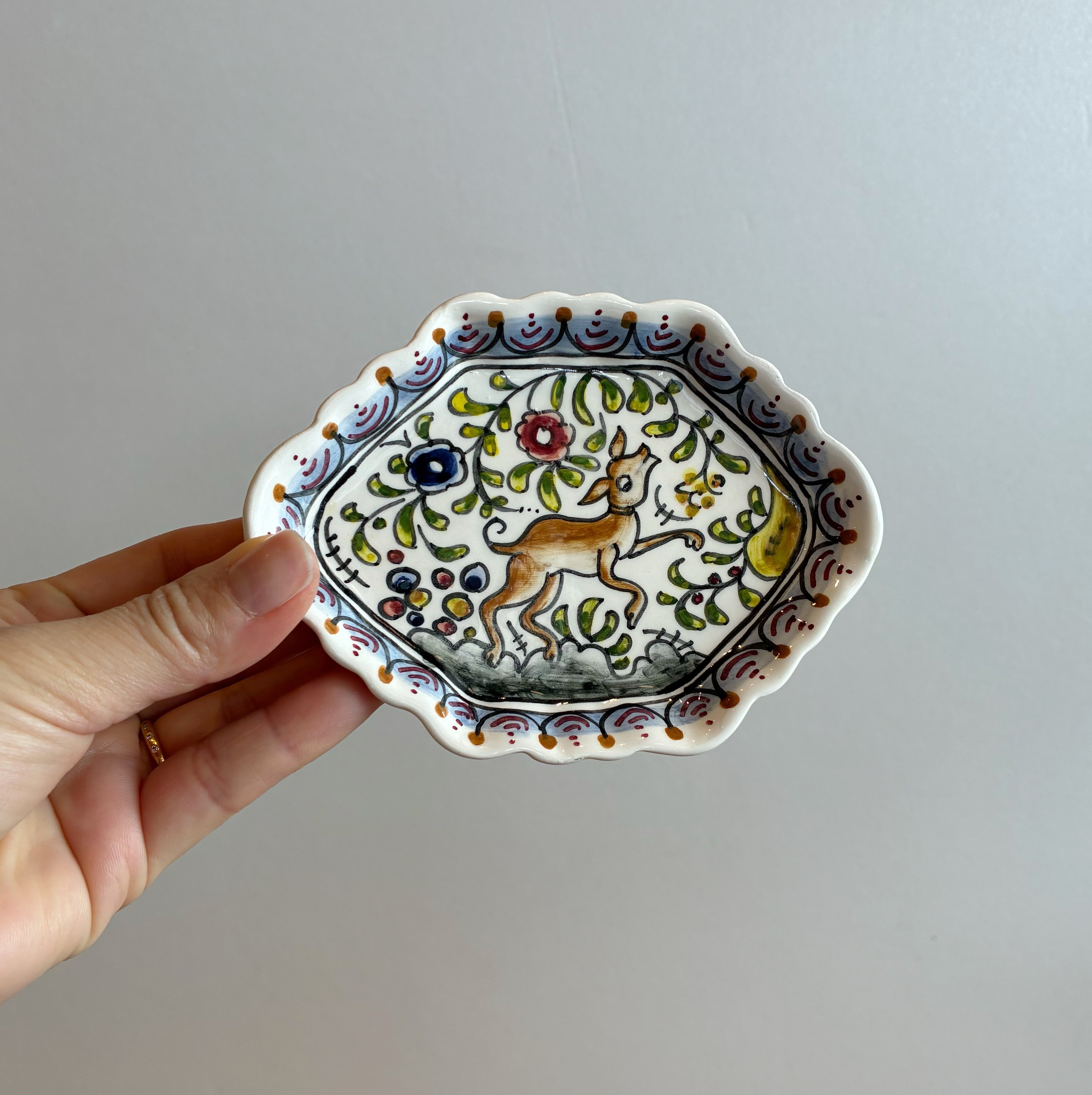 ハンドペイントで描かれた鹿や植物の文様は、おおらかで温かみのある雰囲気が魅力的です。