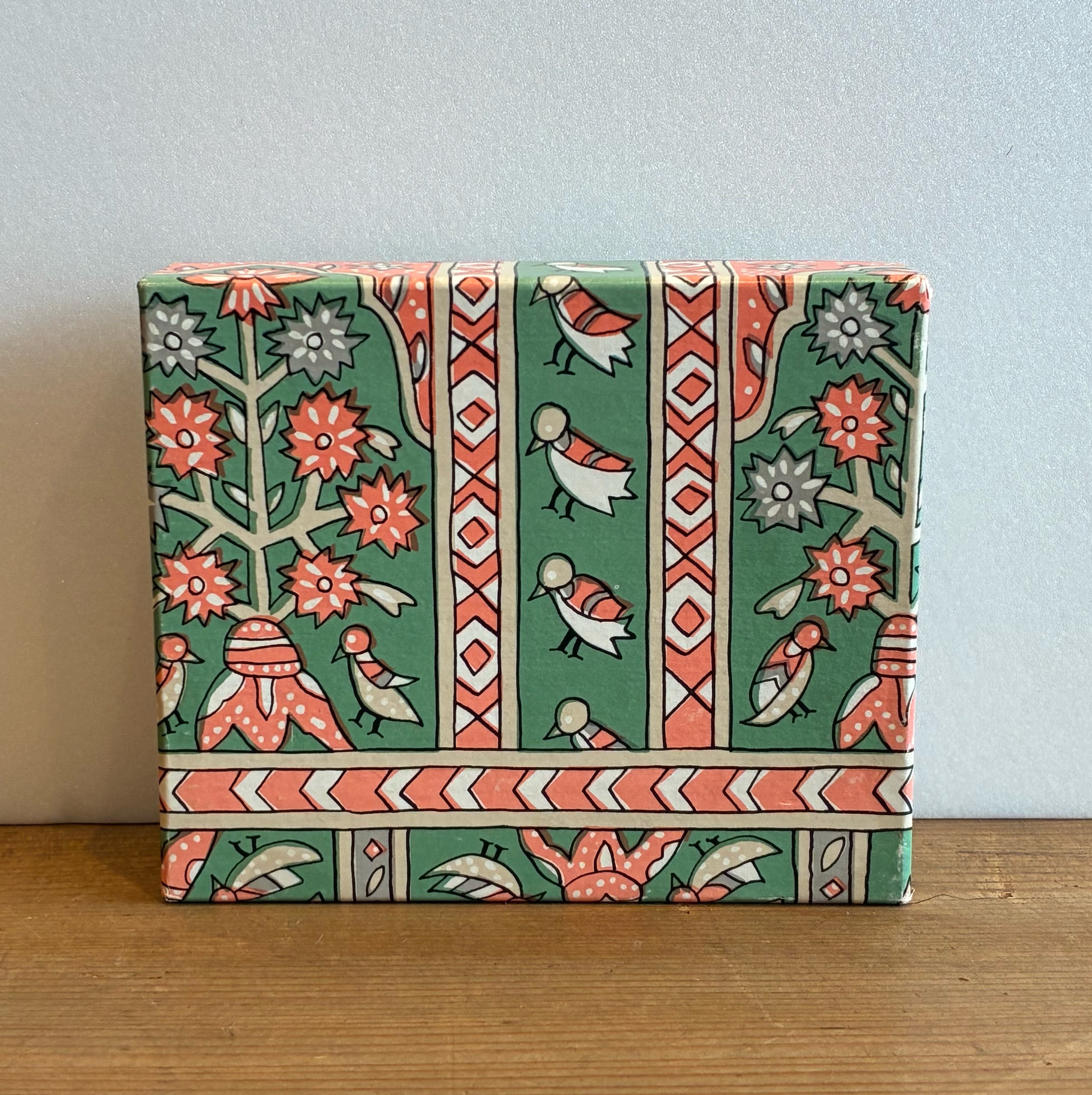 鳥や草花模様が鮮やかな色使いで描かれています。