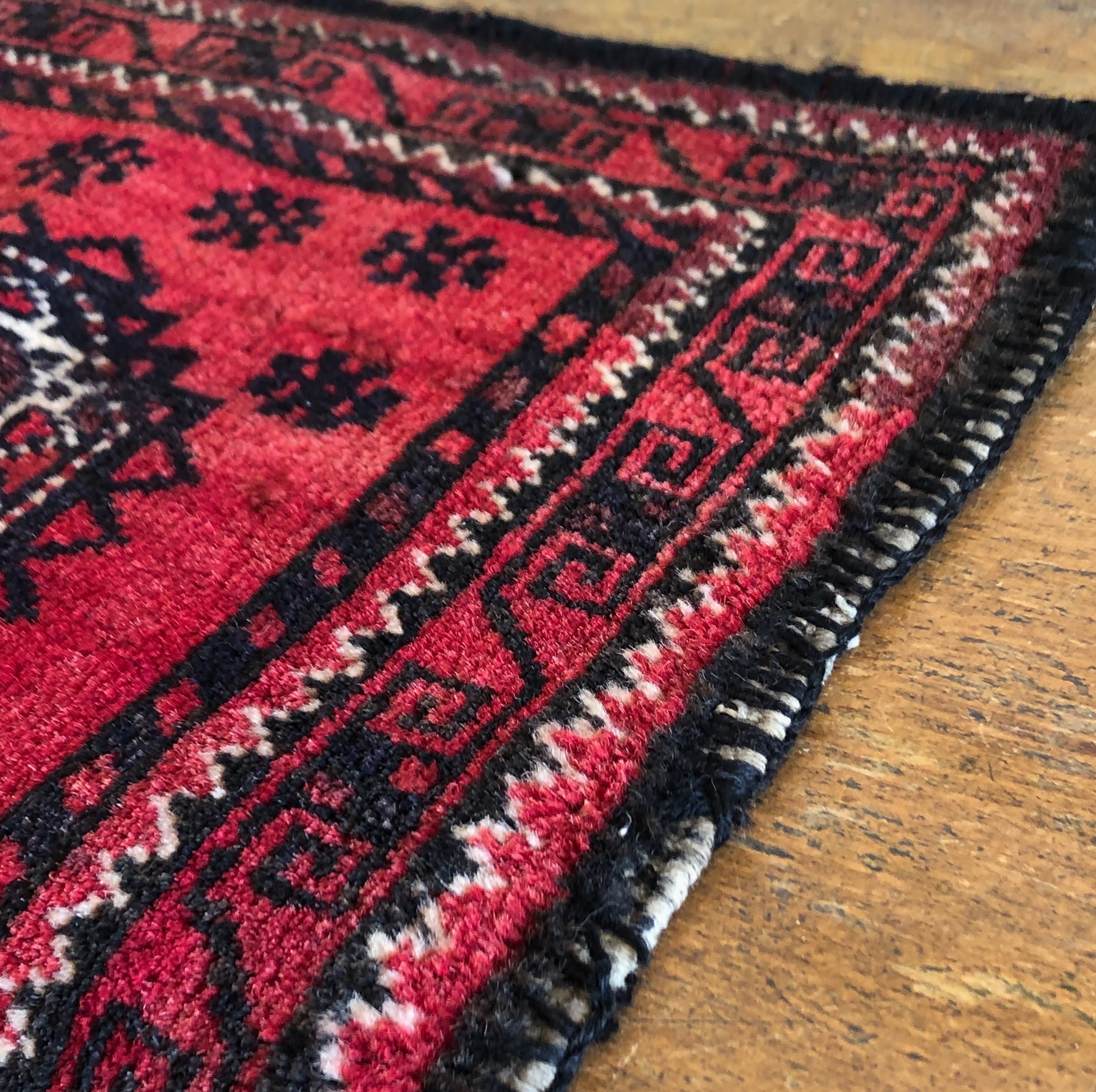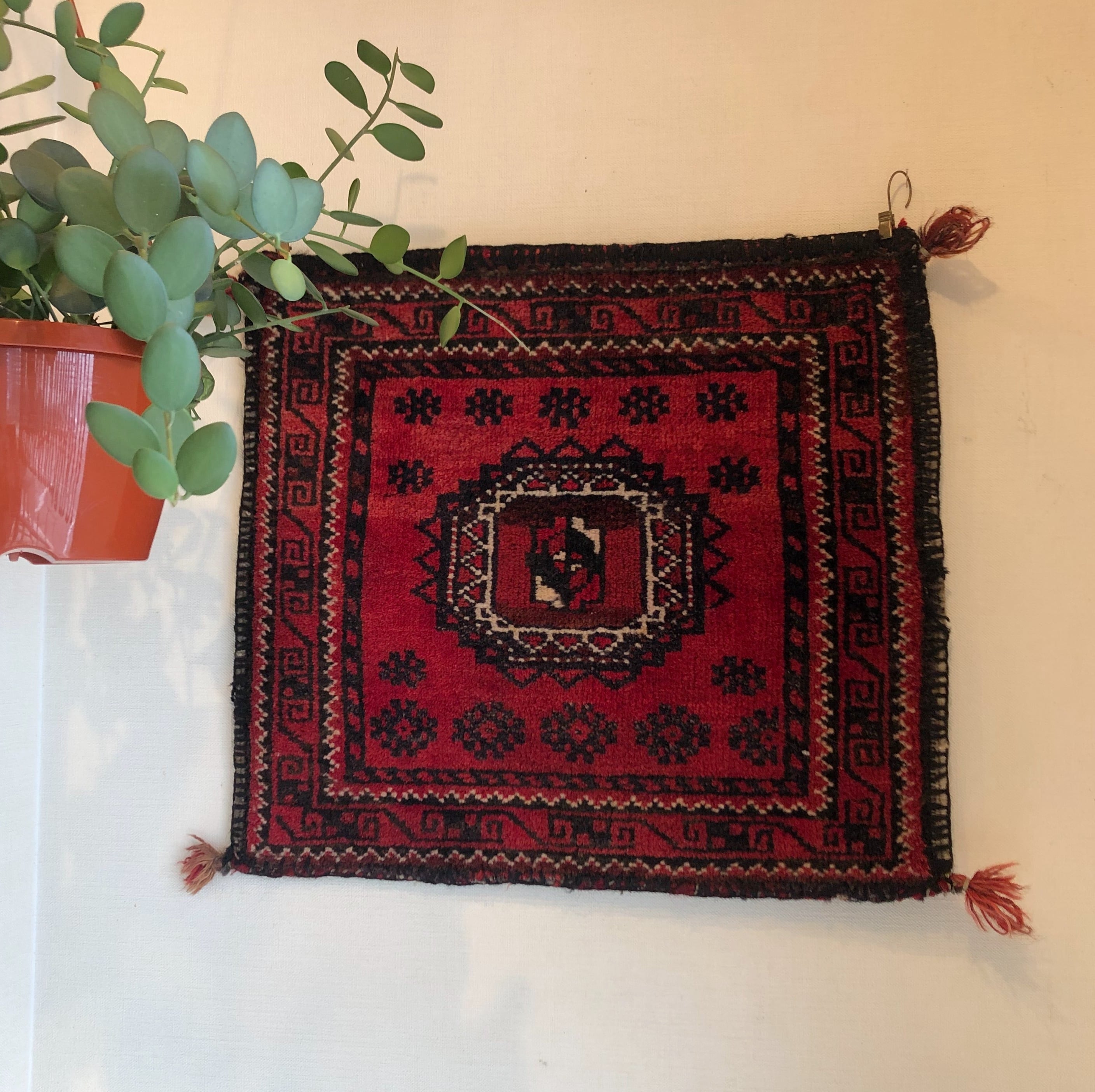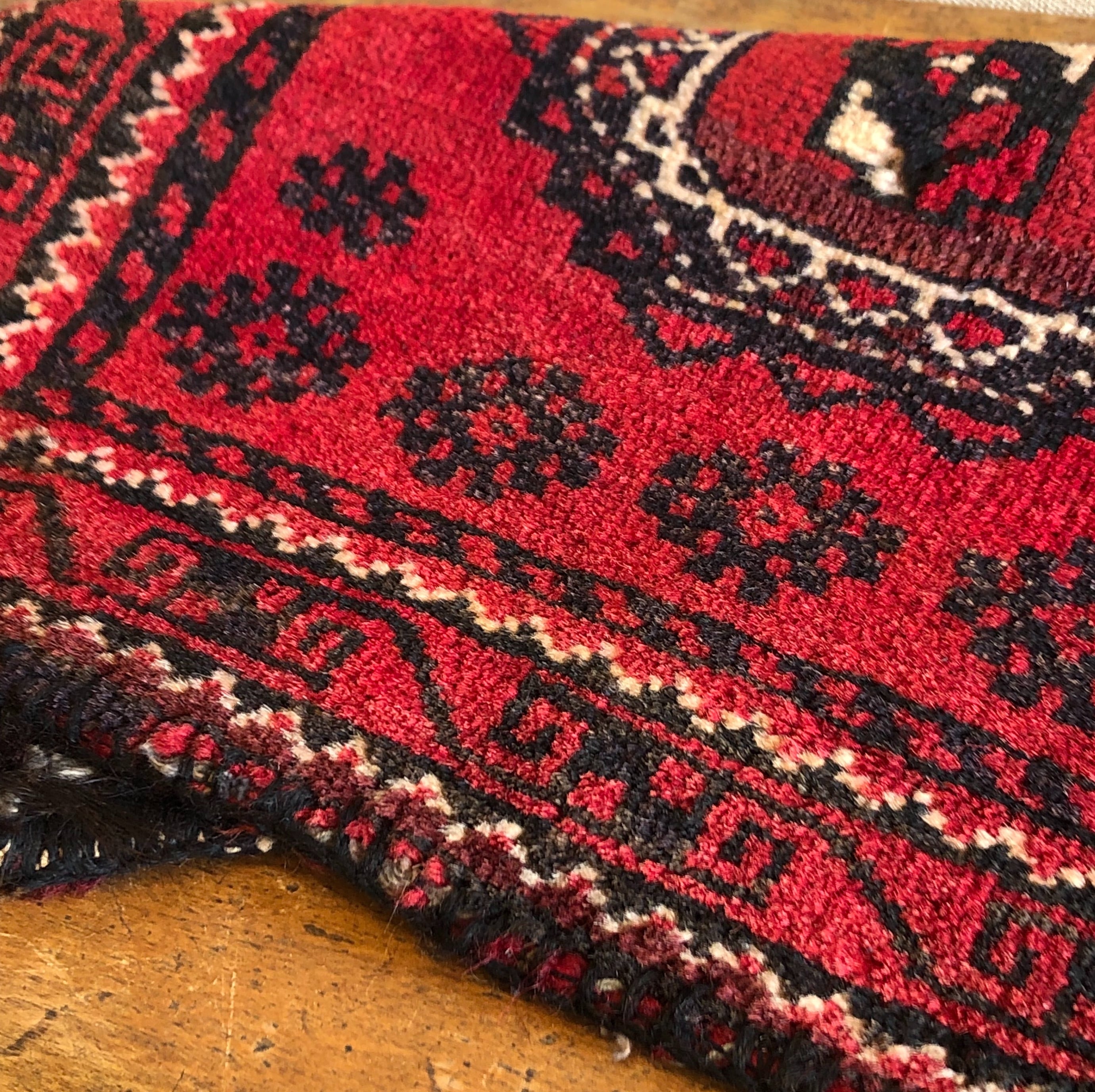 中心のギュル紋様が目を引く赤いヴィンテージトライバルラグ。