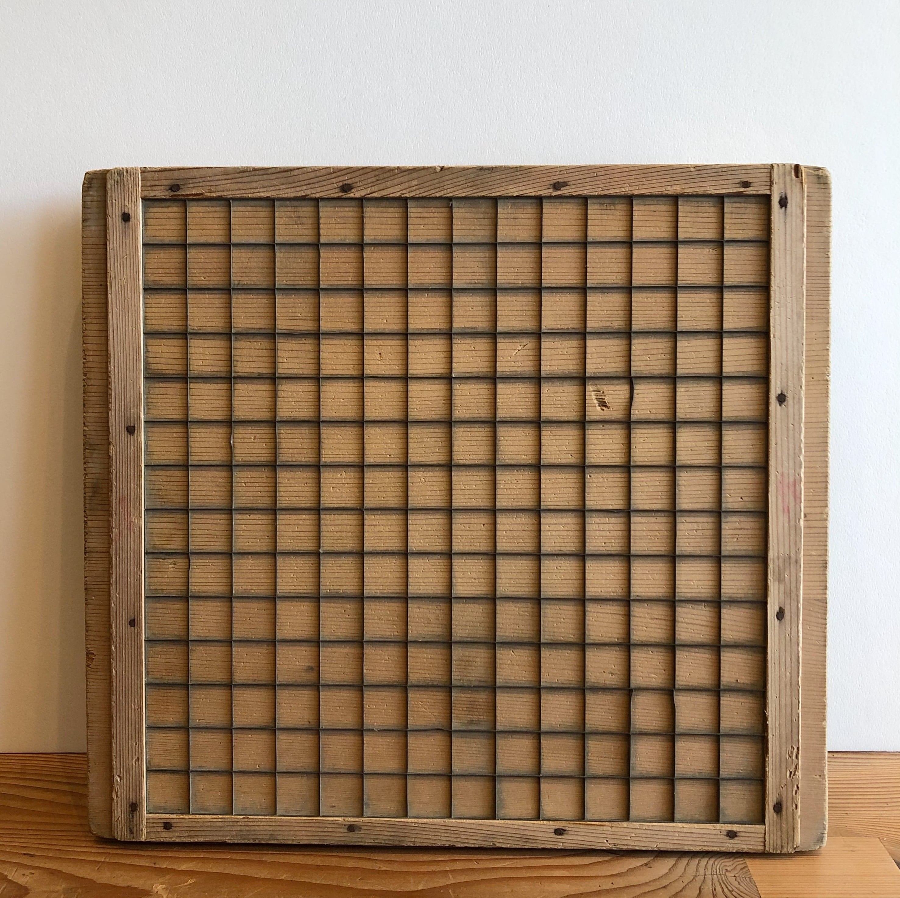 鉄枠が埋め込まれ、2cm×2cmほどの正方形型が美しく整列した木型です。