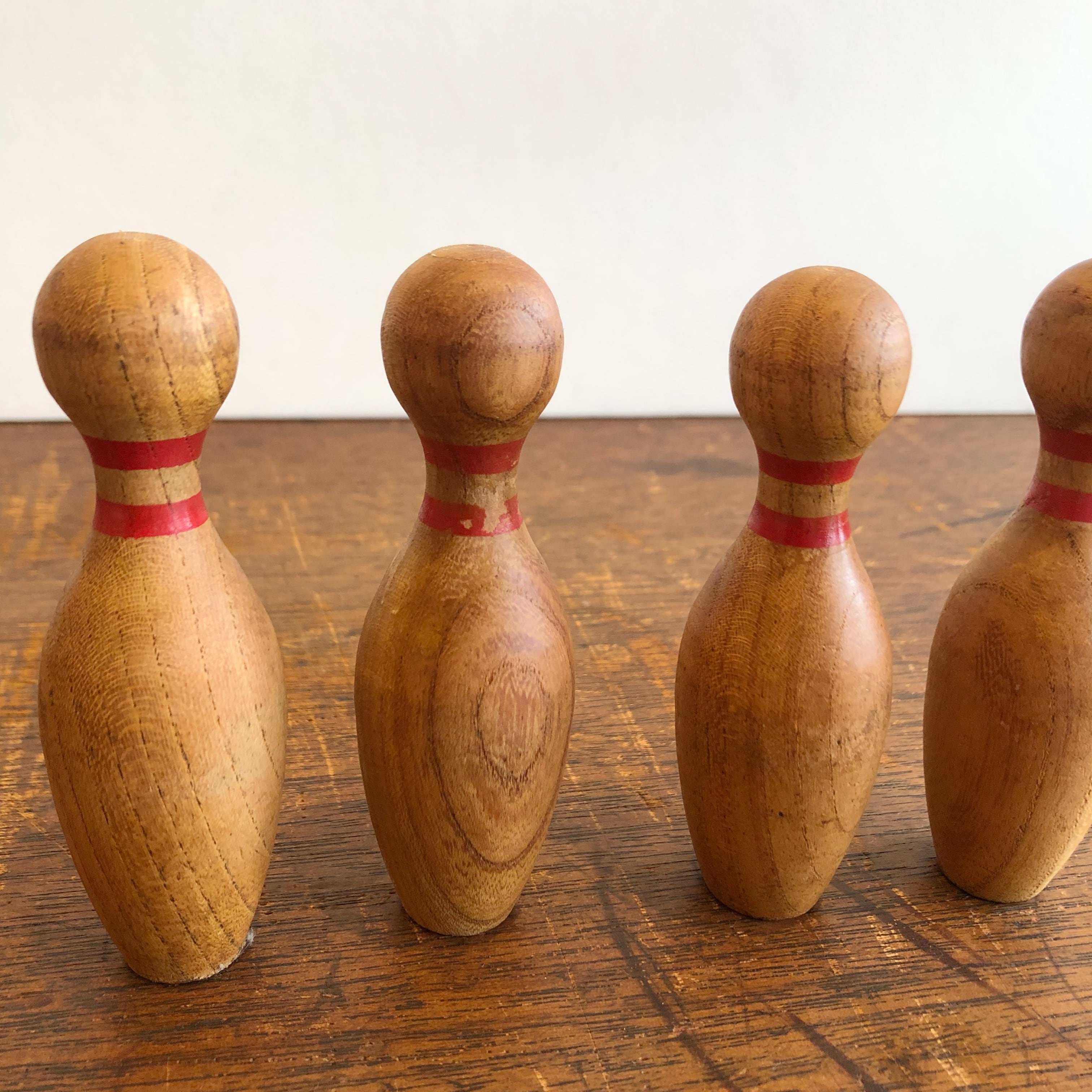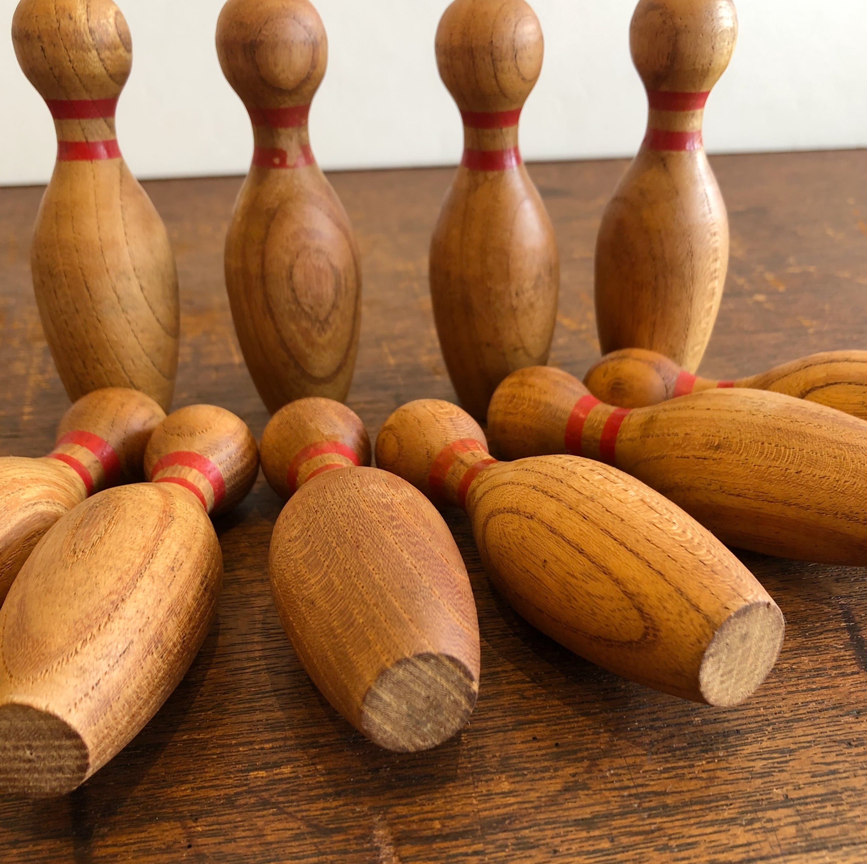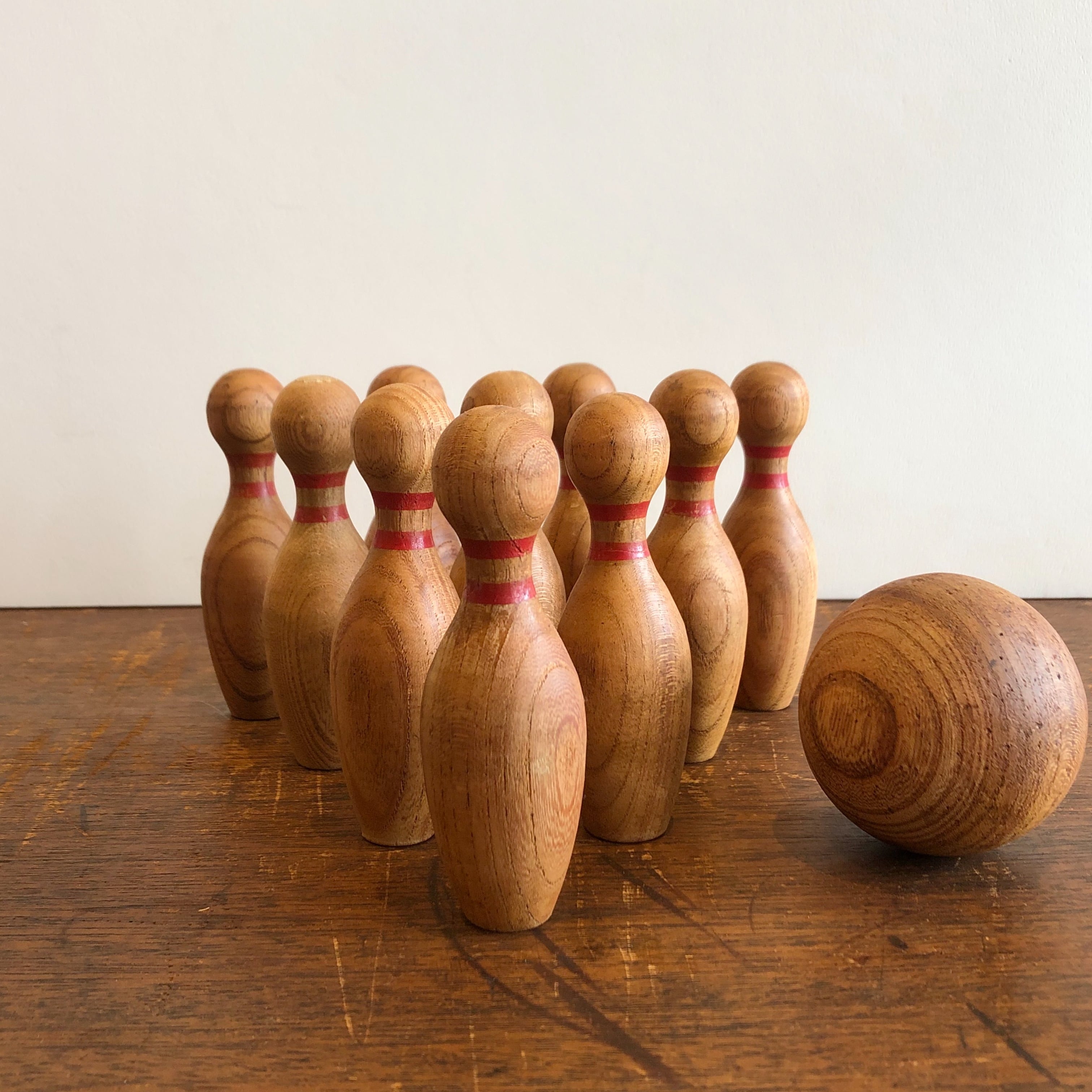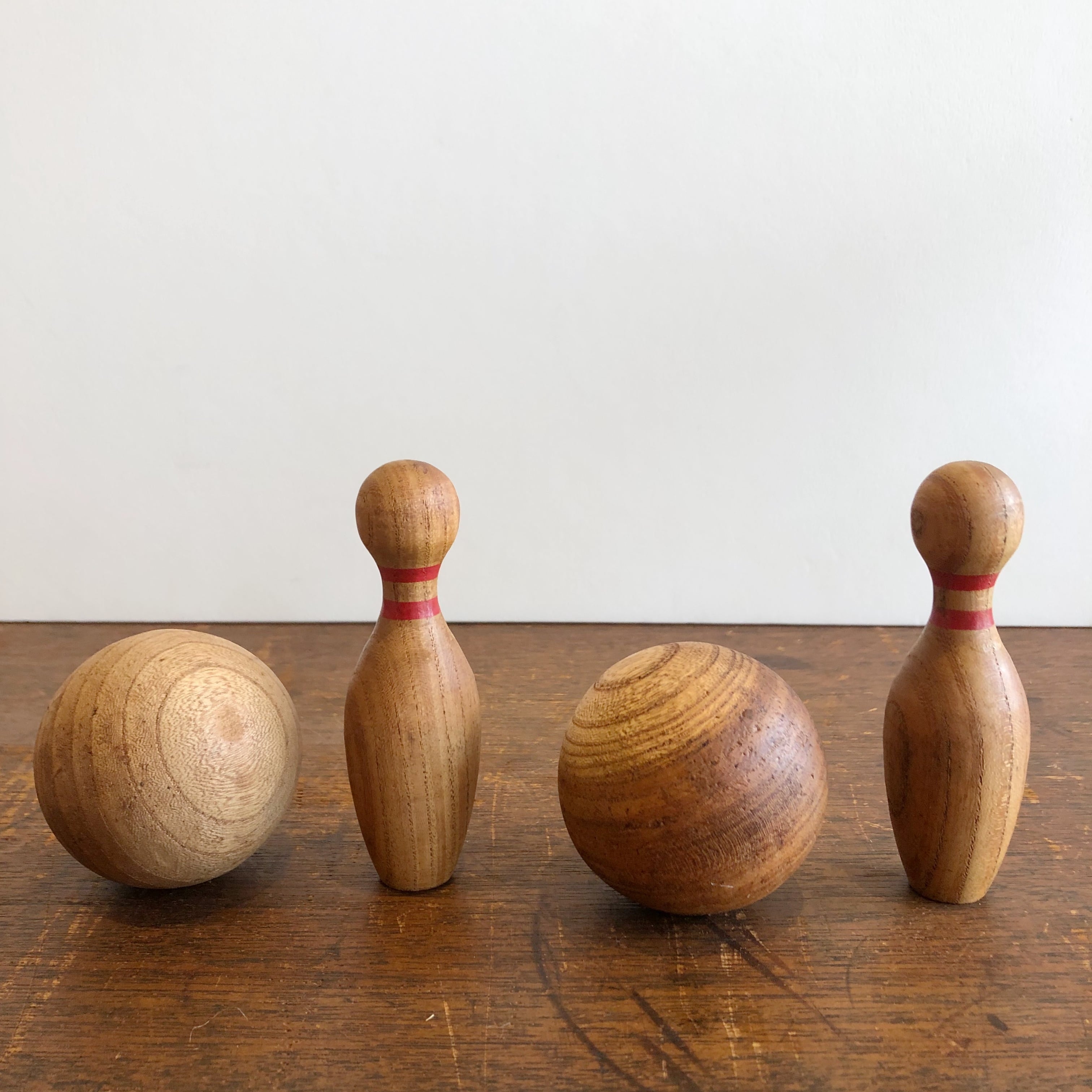 木で作られたボーリングピンとボールのセット。