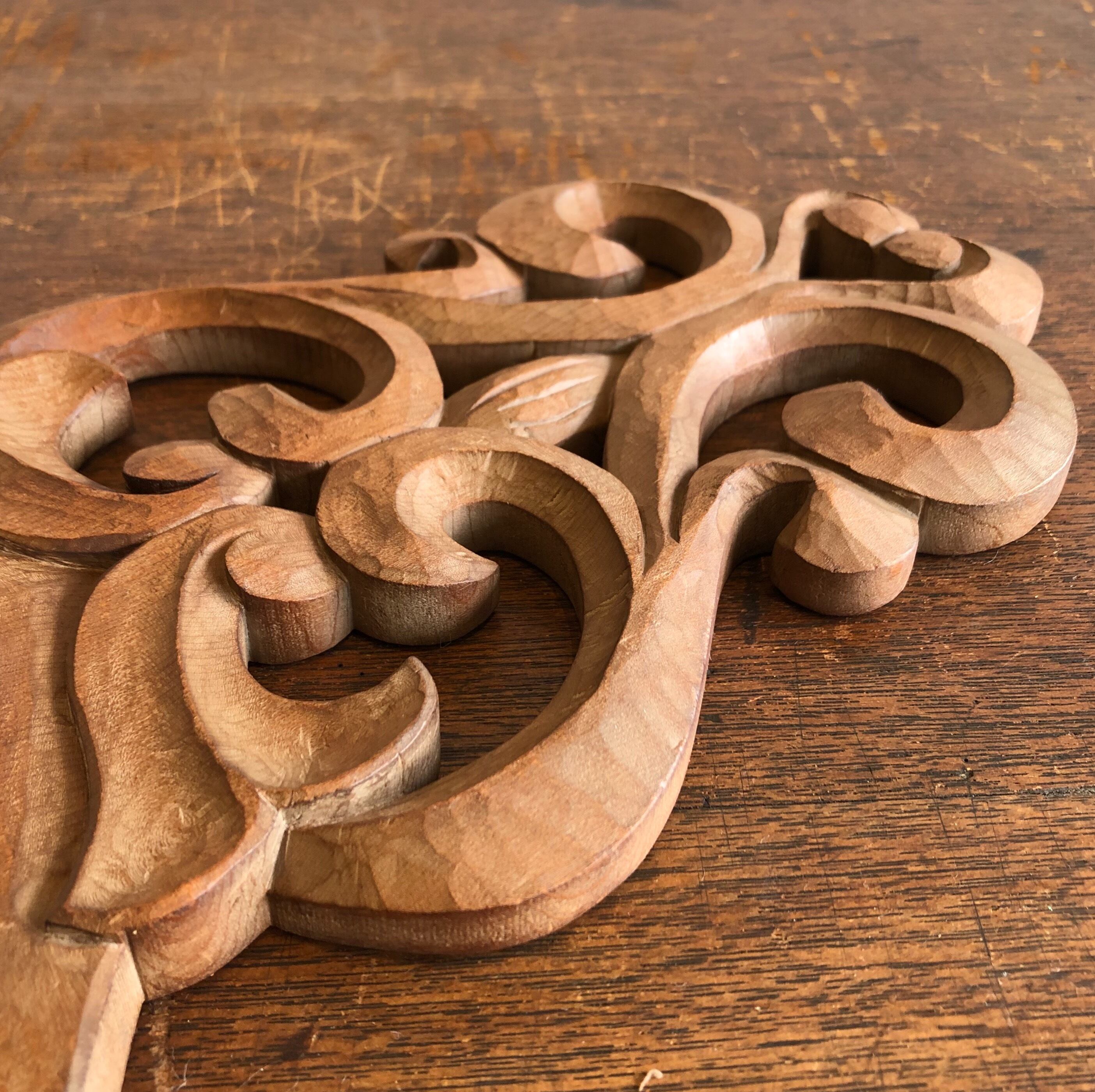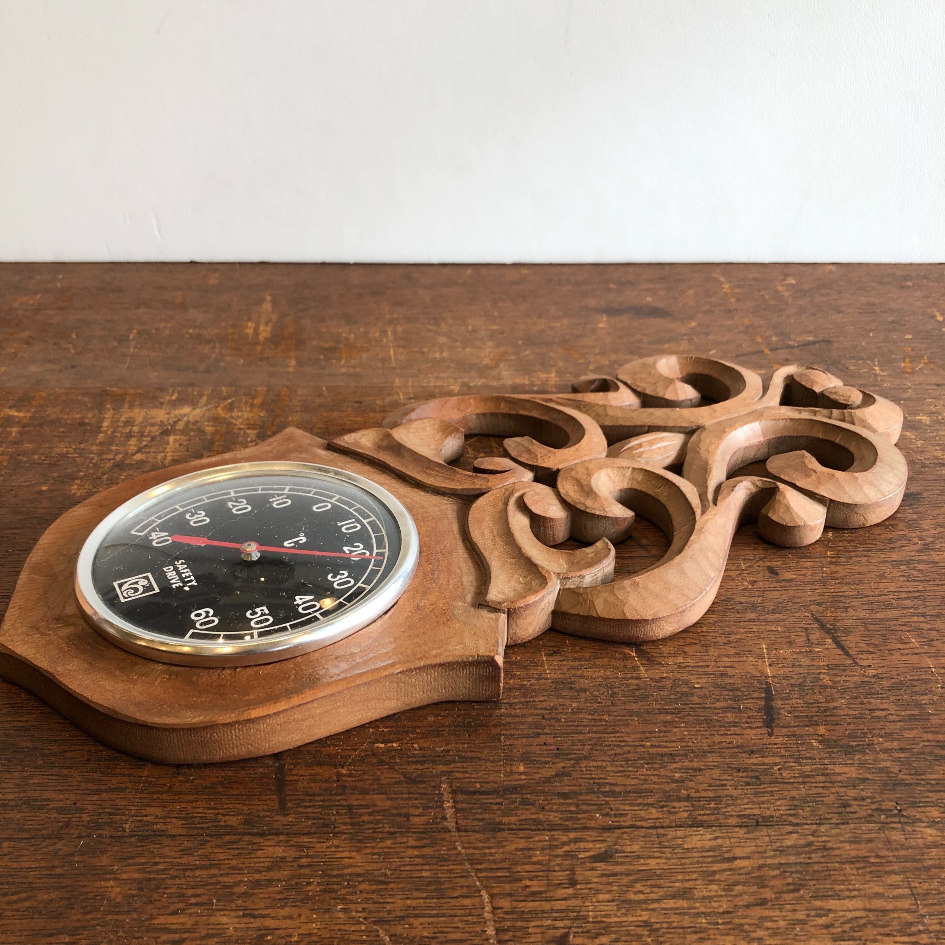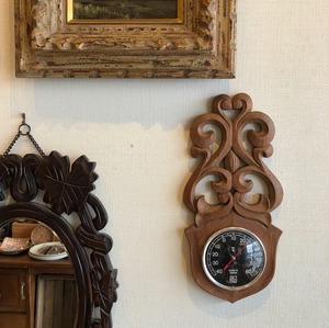 シンメトリーな木彫りが美しい壁掛けの温度計。