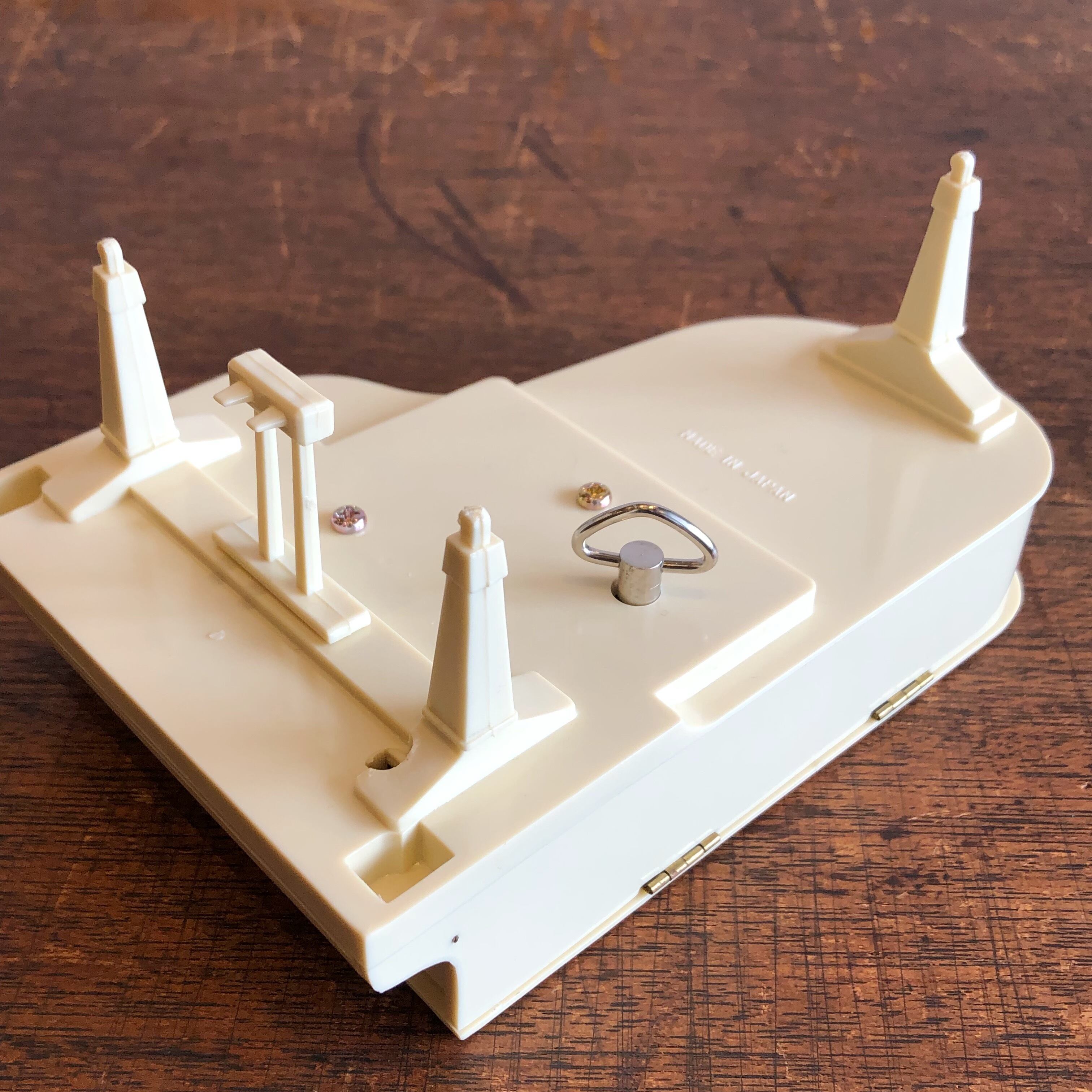 裏面のゼンマイを巻いておけば、鍵盤蓋を開けると曲が始まり、閉めれば止まります。
