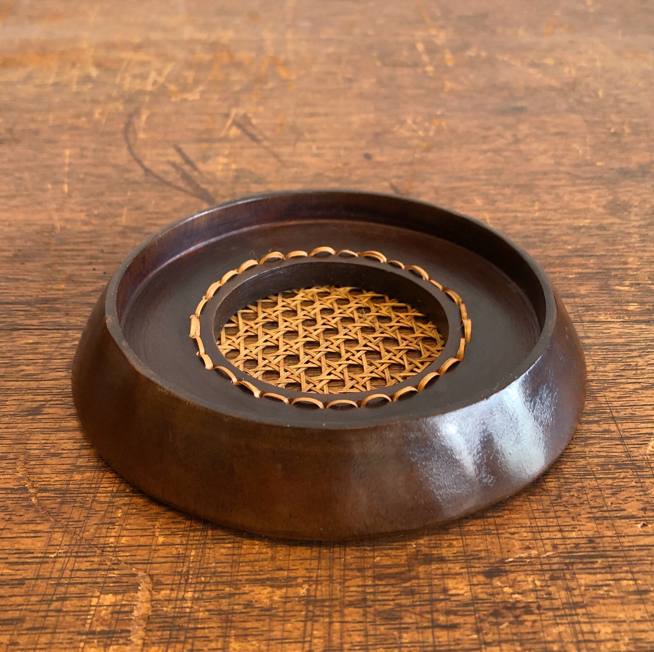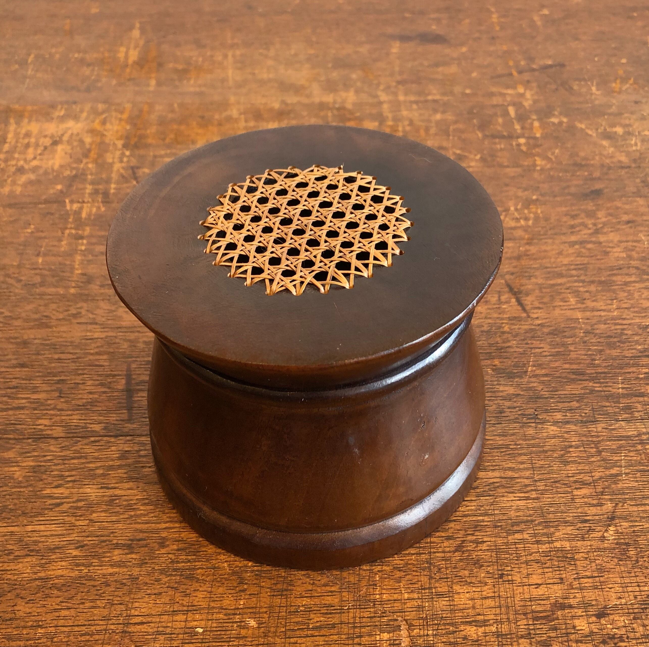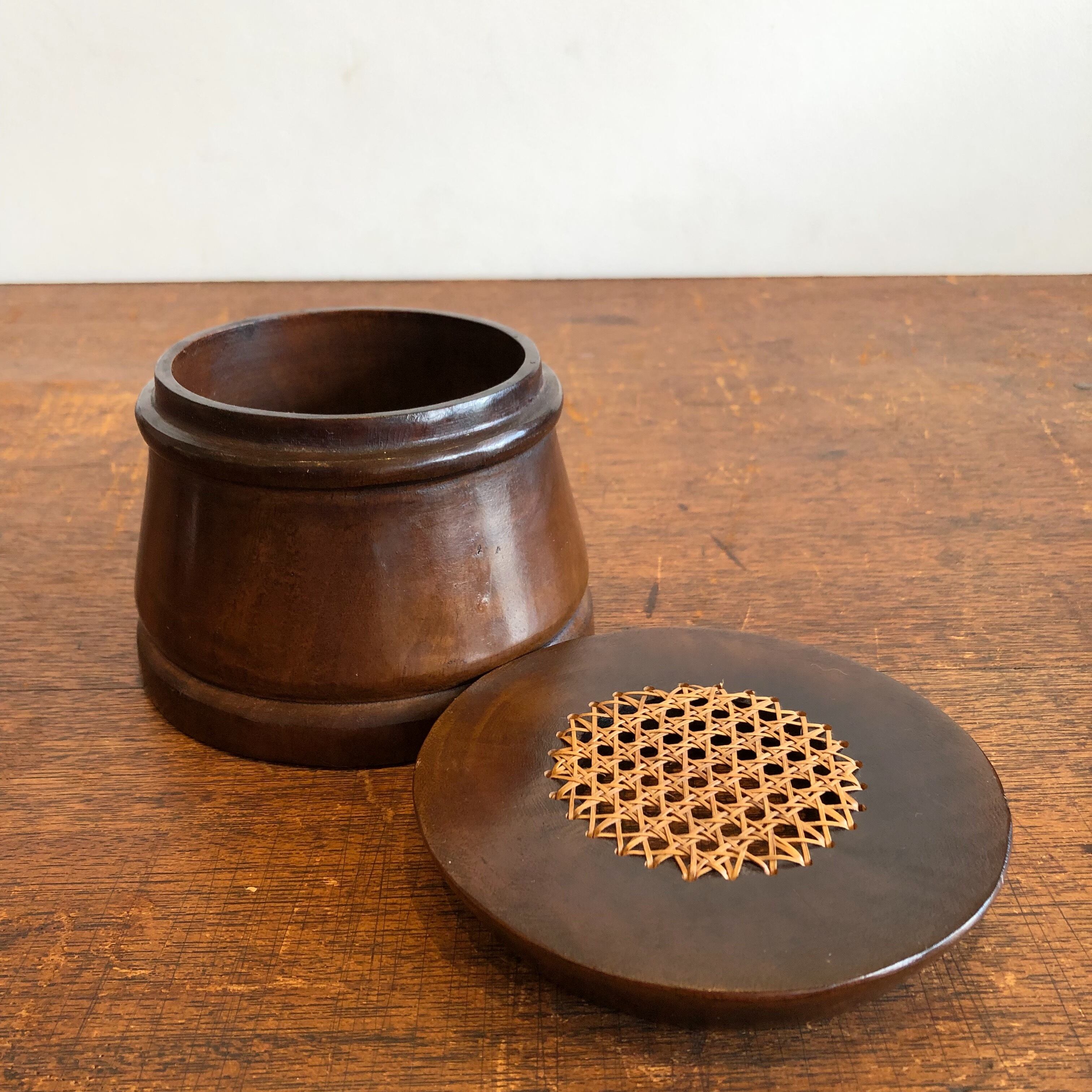 細かなラタン編みが美しい蓋付きの小物入れ。