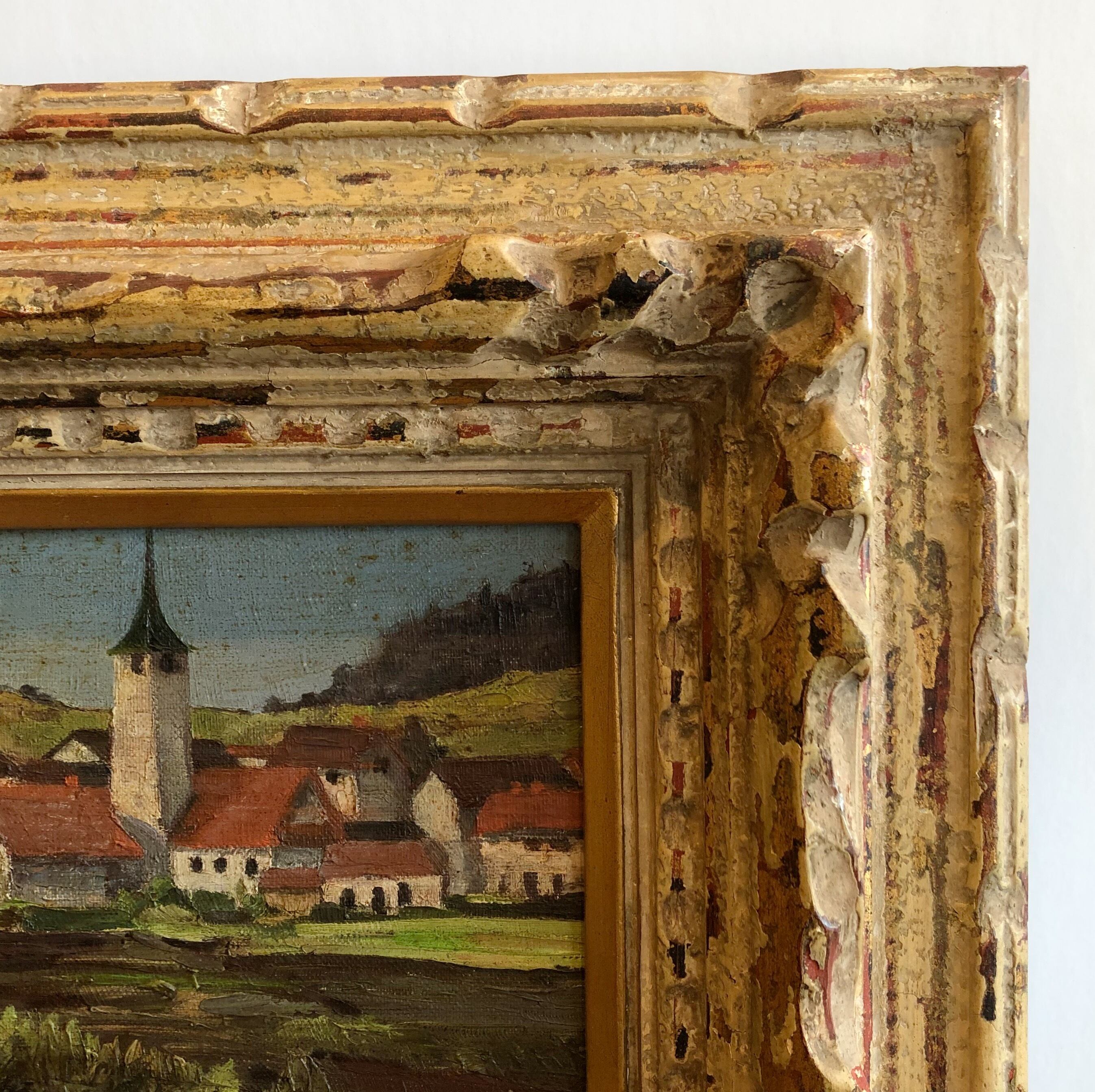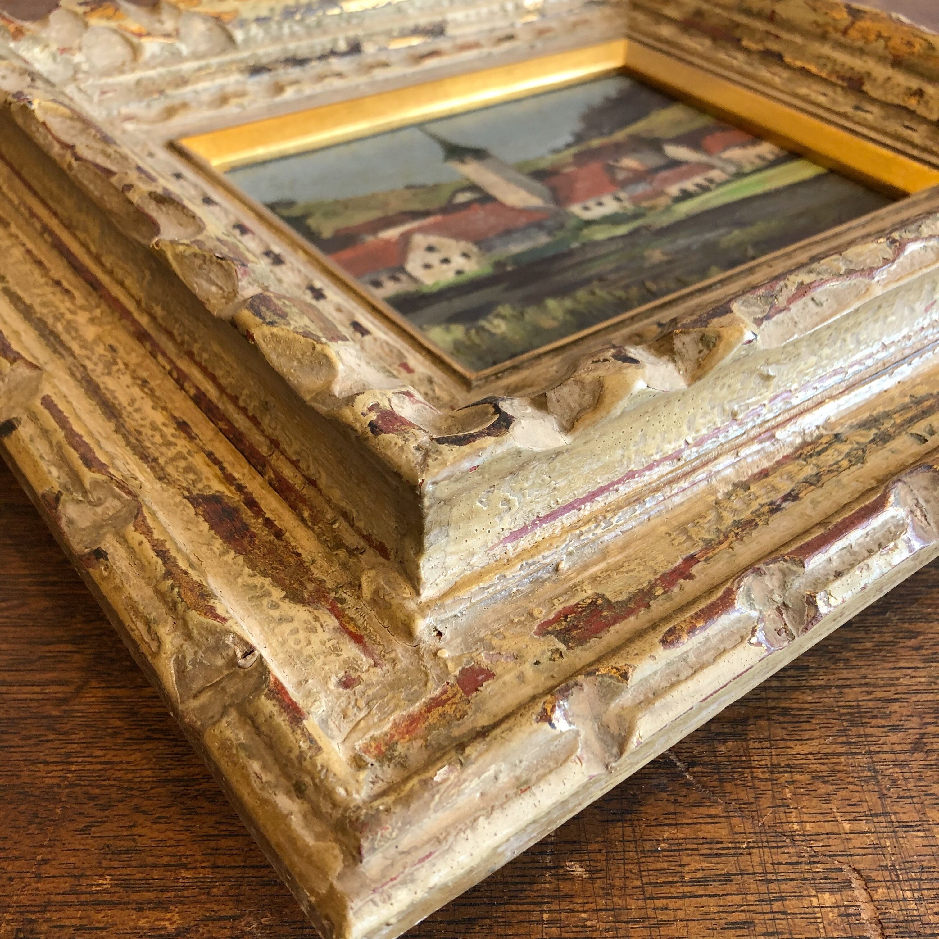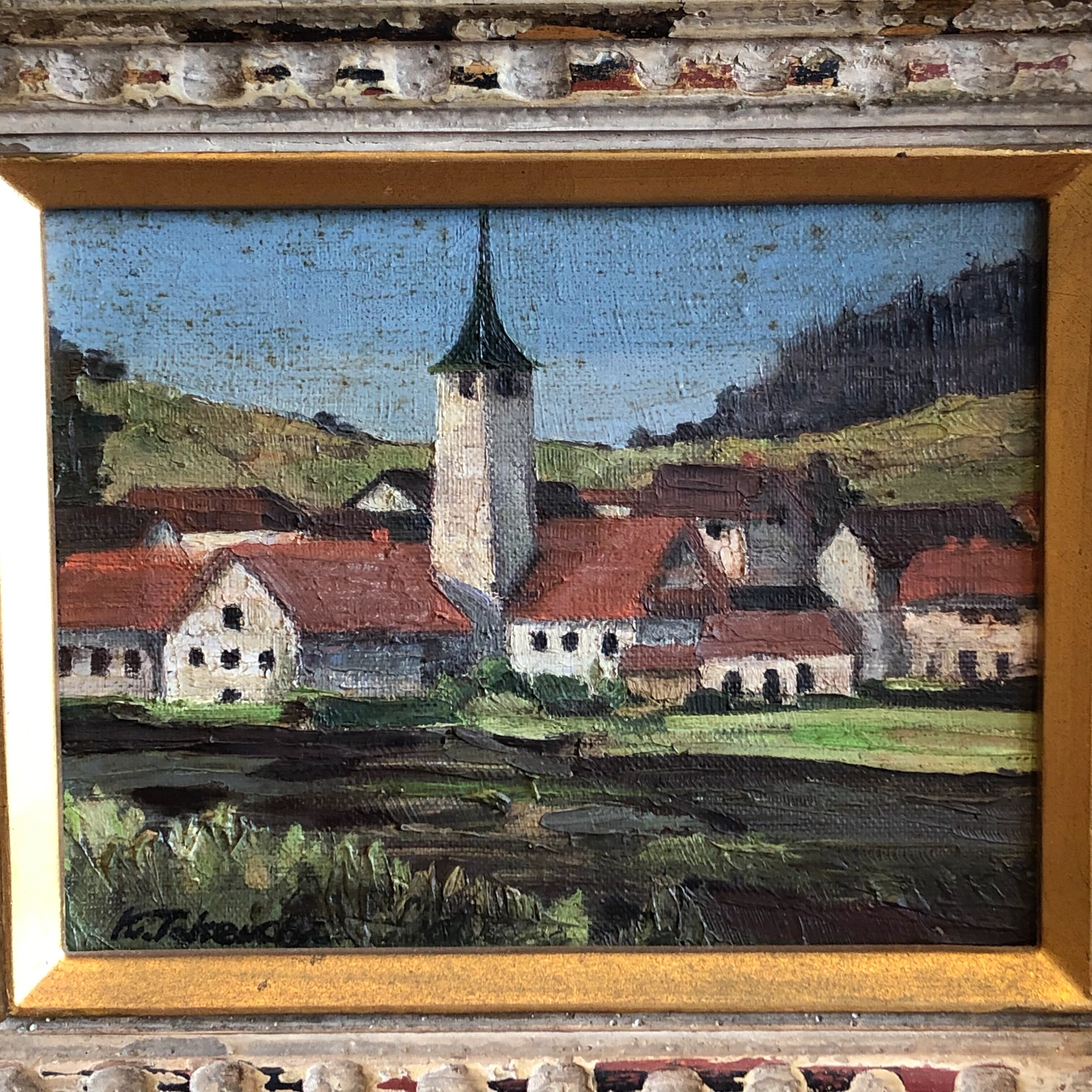 作者や年代など詳細は不明ですが、どこか外国の田舎町の美しい風景がキャンバスに描かれた油絵です。