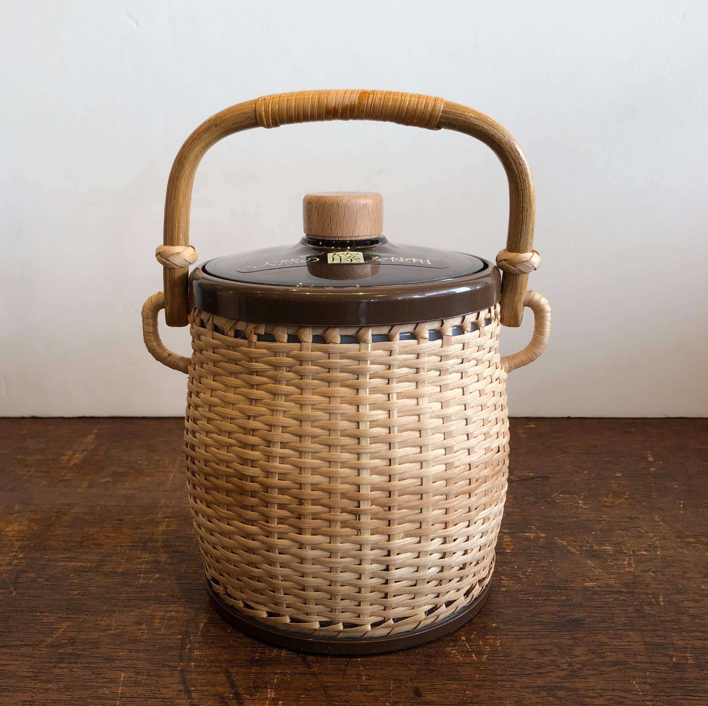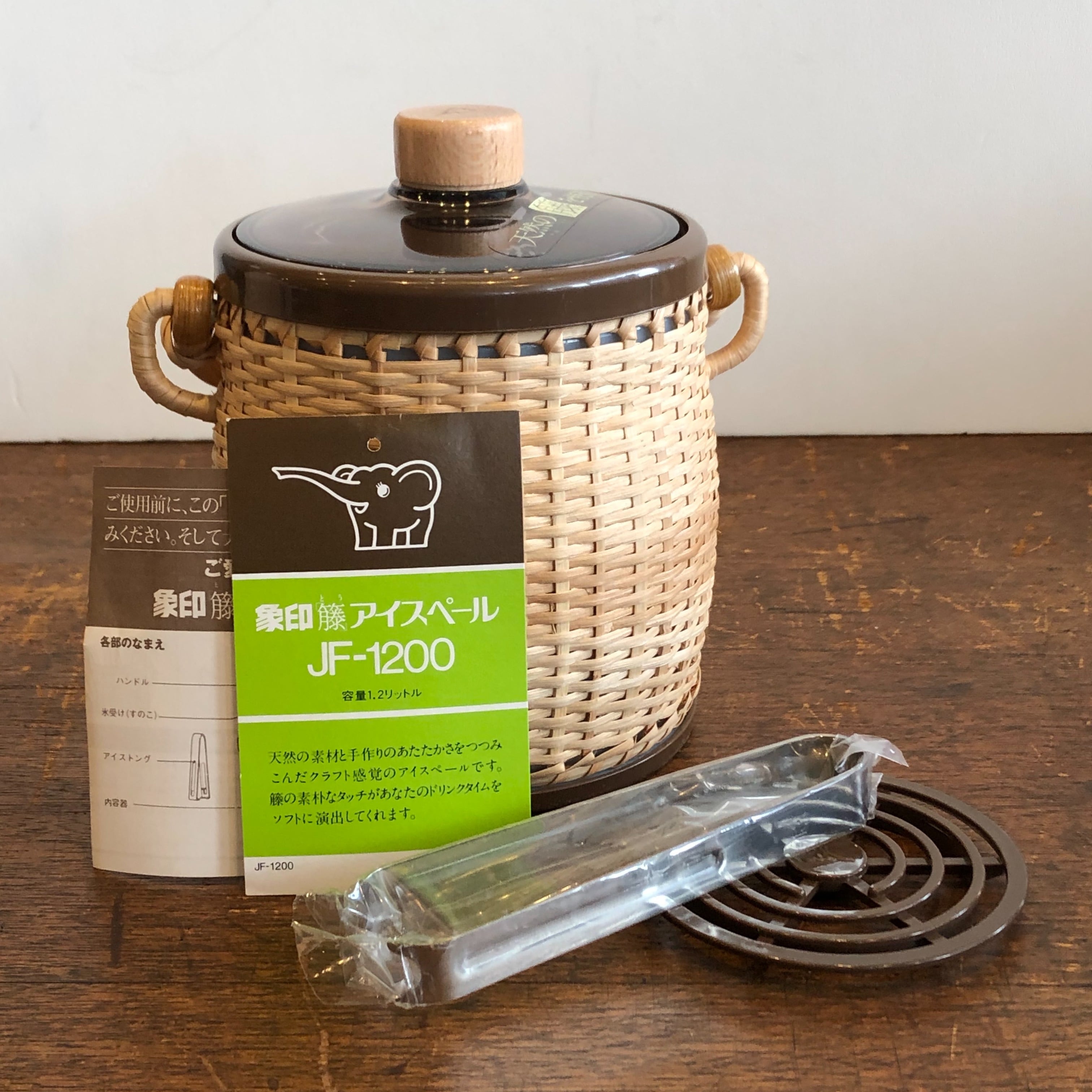 素材:スチロール樹脂(蓋)、ポリプロピレン(内容器)、藤(胴表面)、ポリエチレン(胴本体、すのこ)、ステンレス鋼(アイストング)