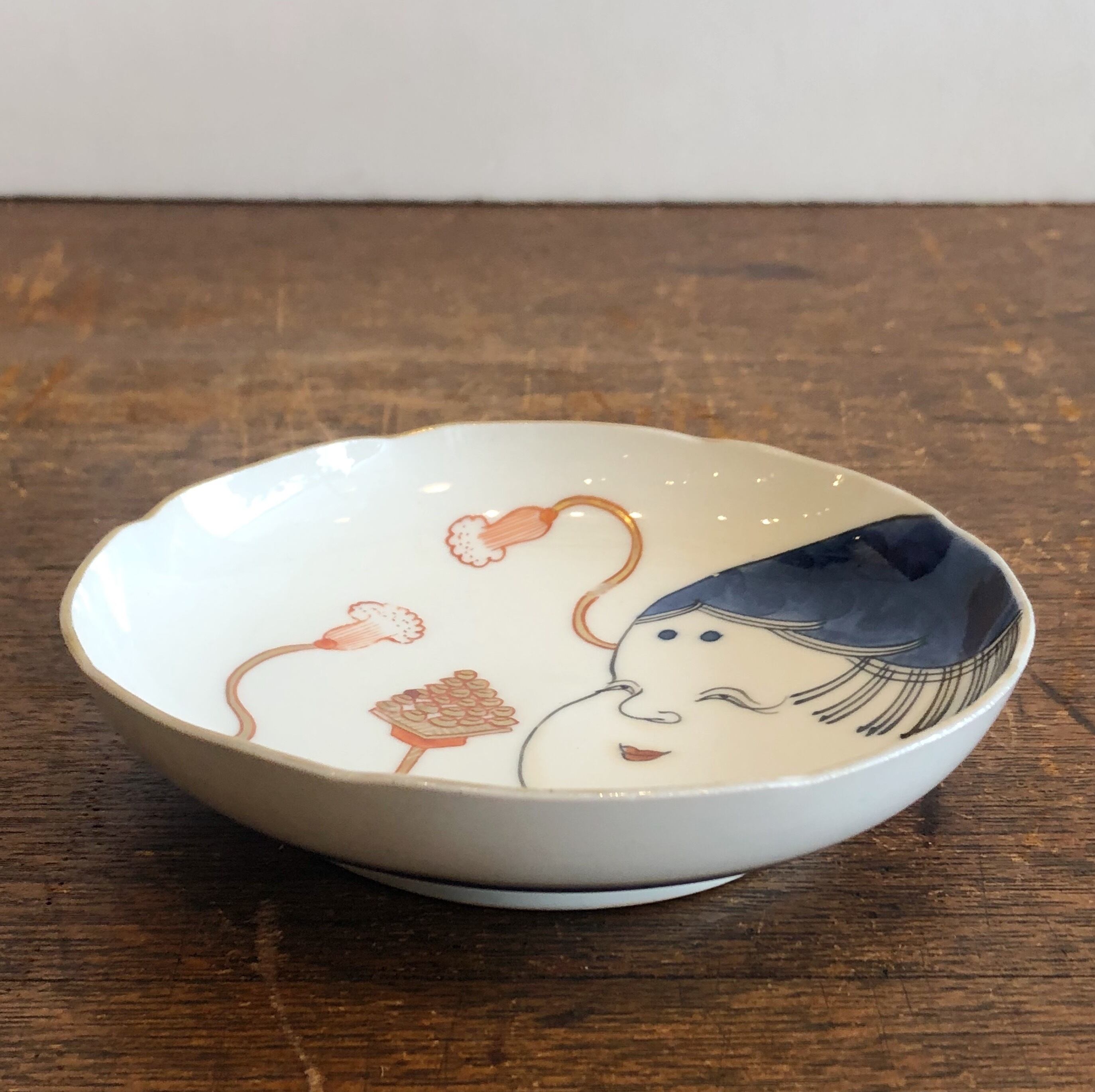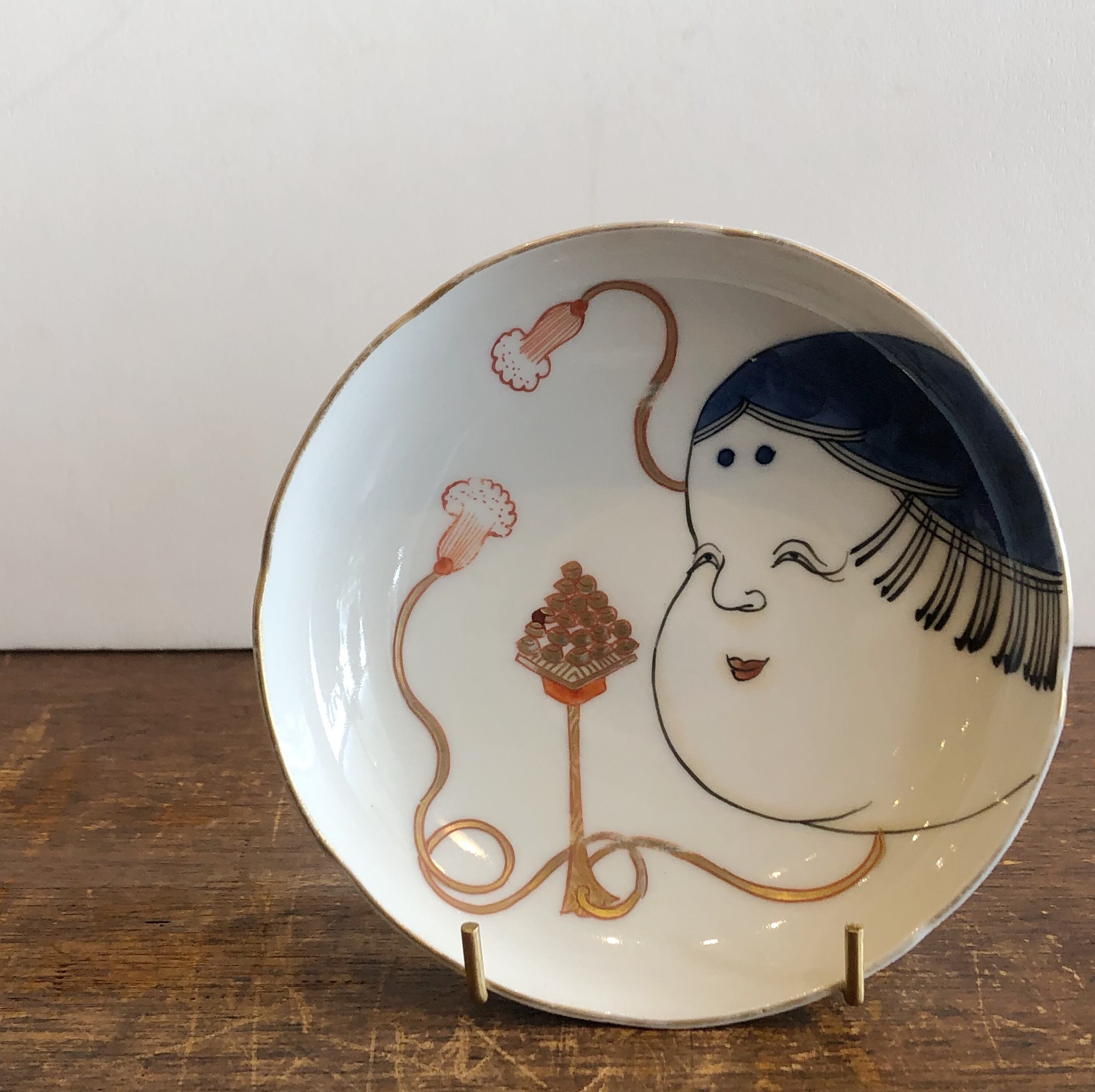 福を呼ぶご利益のあるお面と、魔を退け、神様を呼ぶ効果があると言われる鈴はどちらも縁起が良く、お正月などおめでたいシーンにぴったりのお皿です。