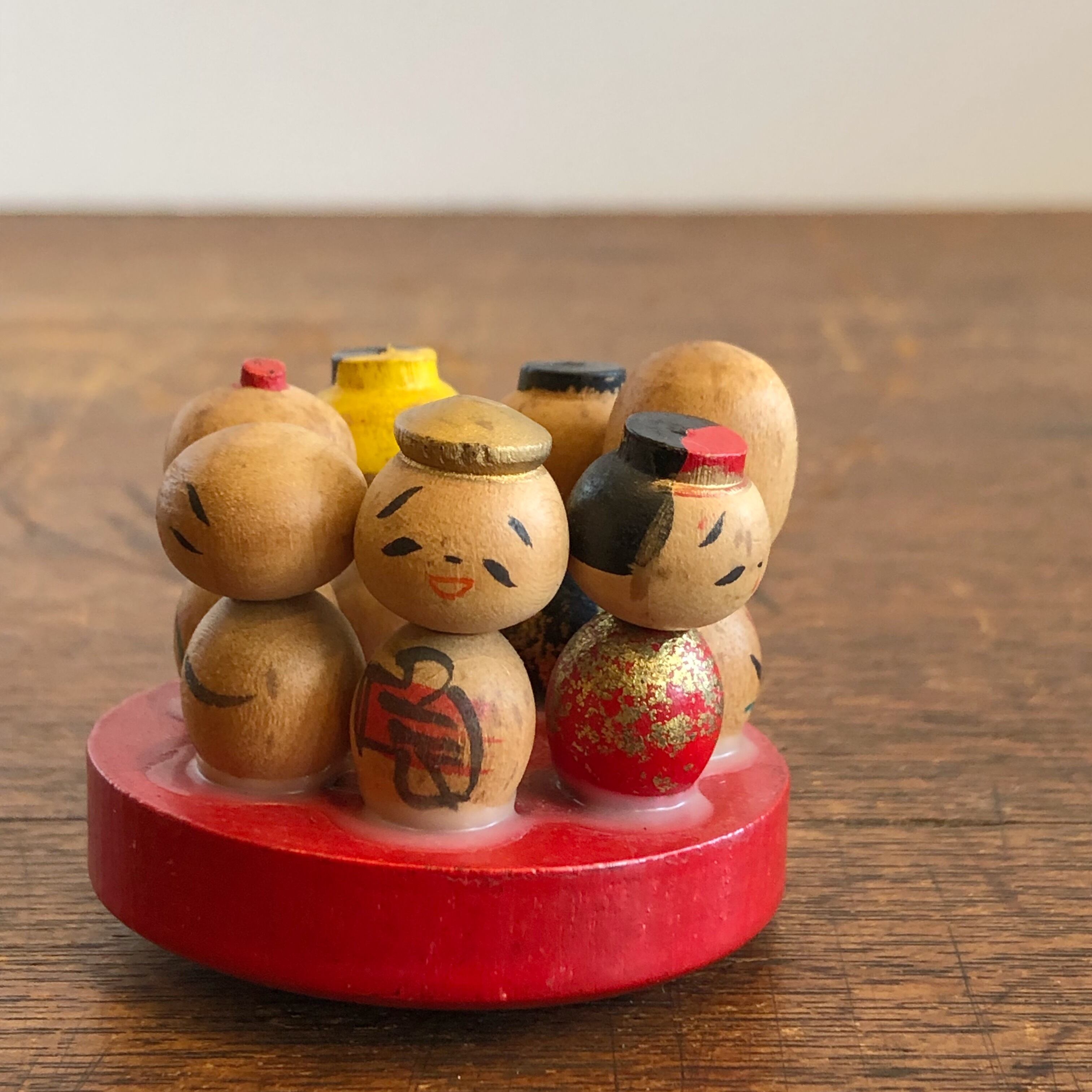 縁起の良い宝船に乗っています。おそらく本来は中心に帆のようなものがあった痕跡がありますが、残念ながら欠損しています。