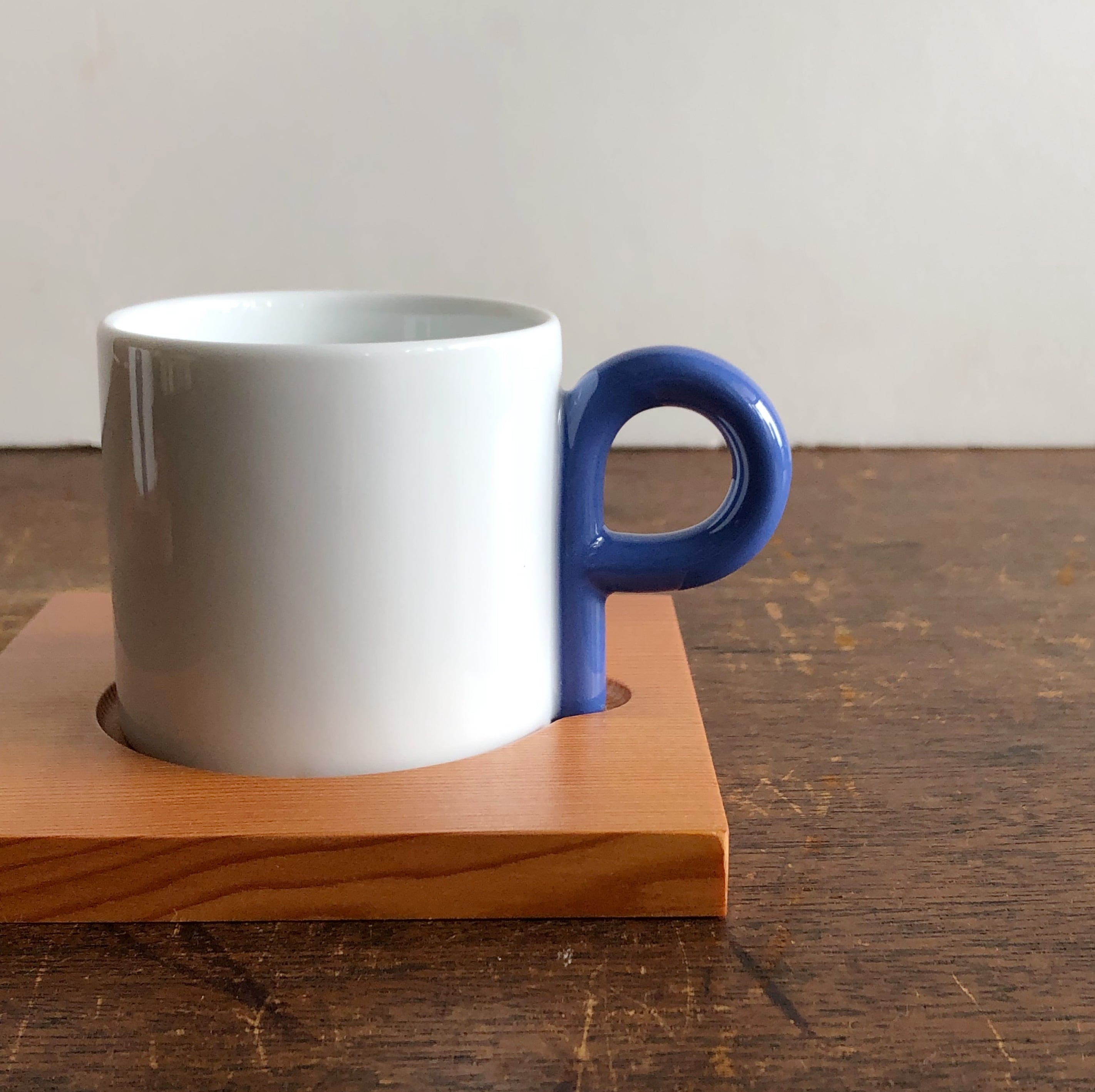 白山陶器の人気デザイン、P型の持ち手がかわいいコーヒーカップと木製ソーサー。