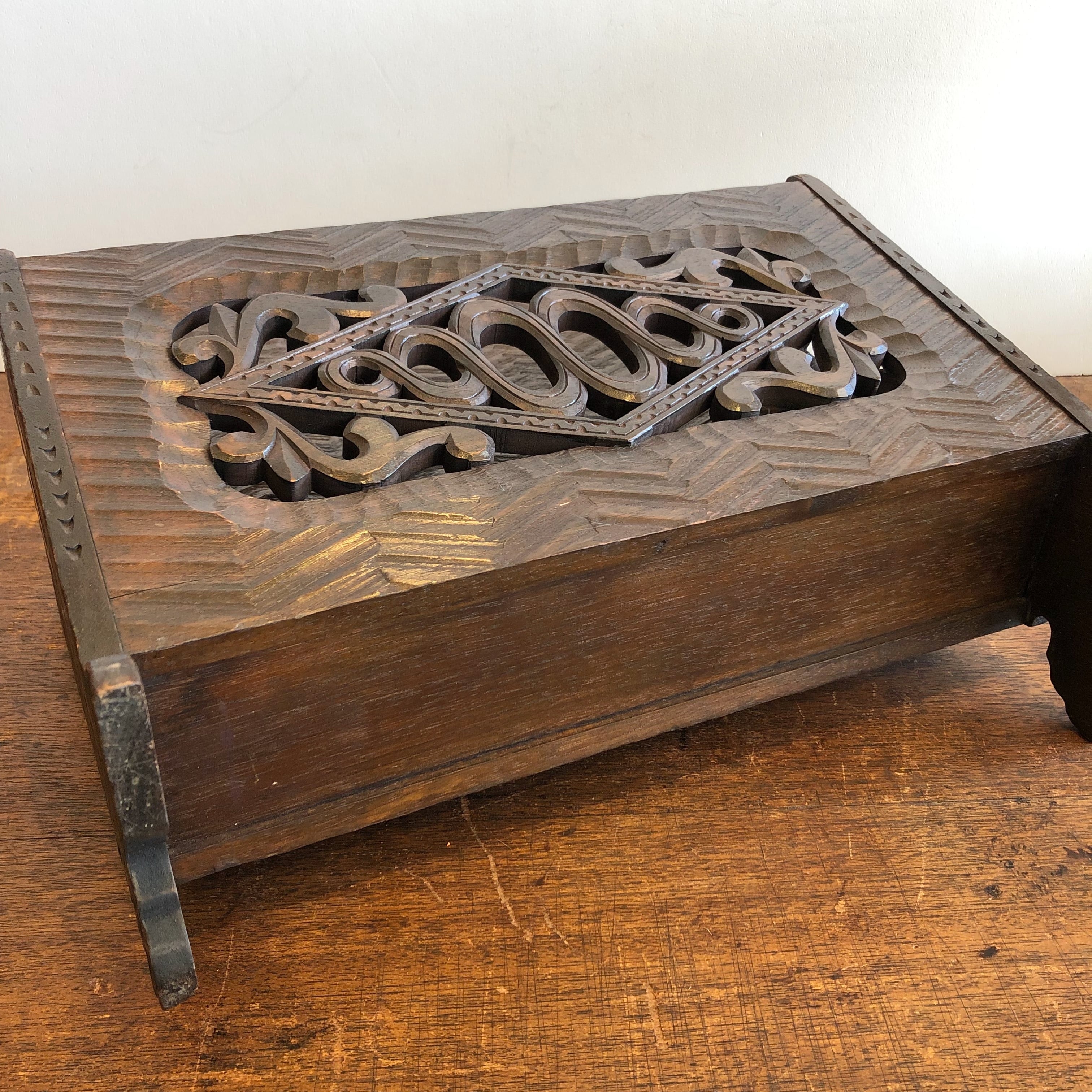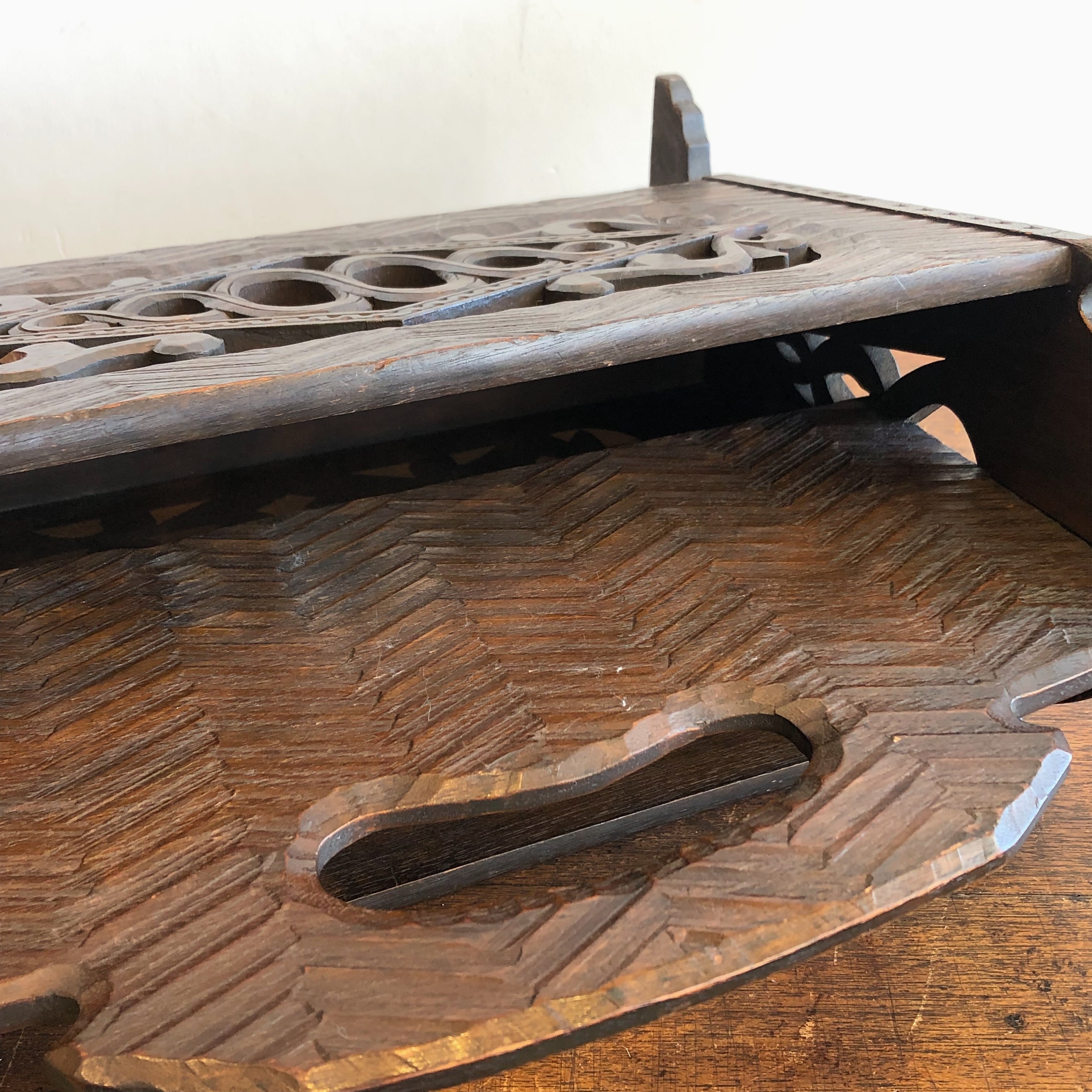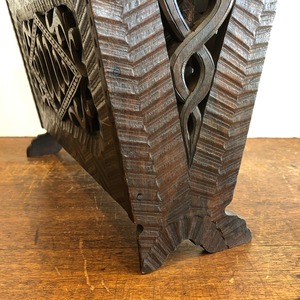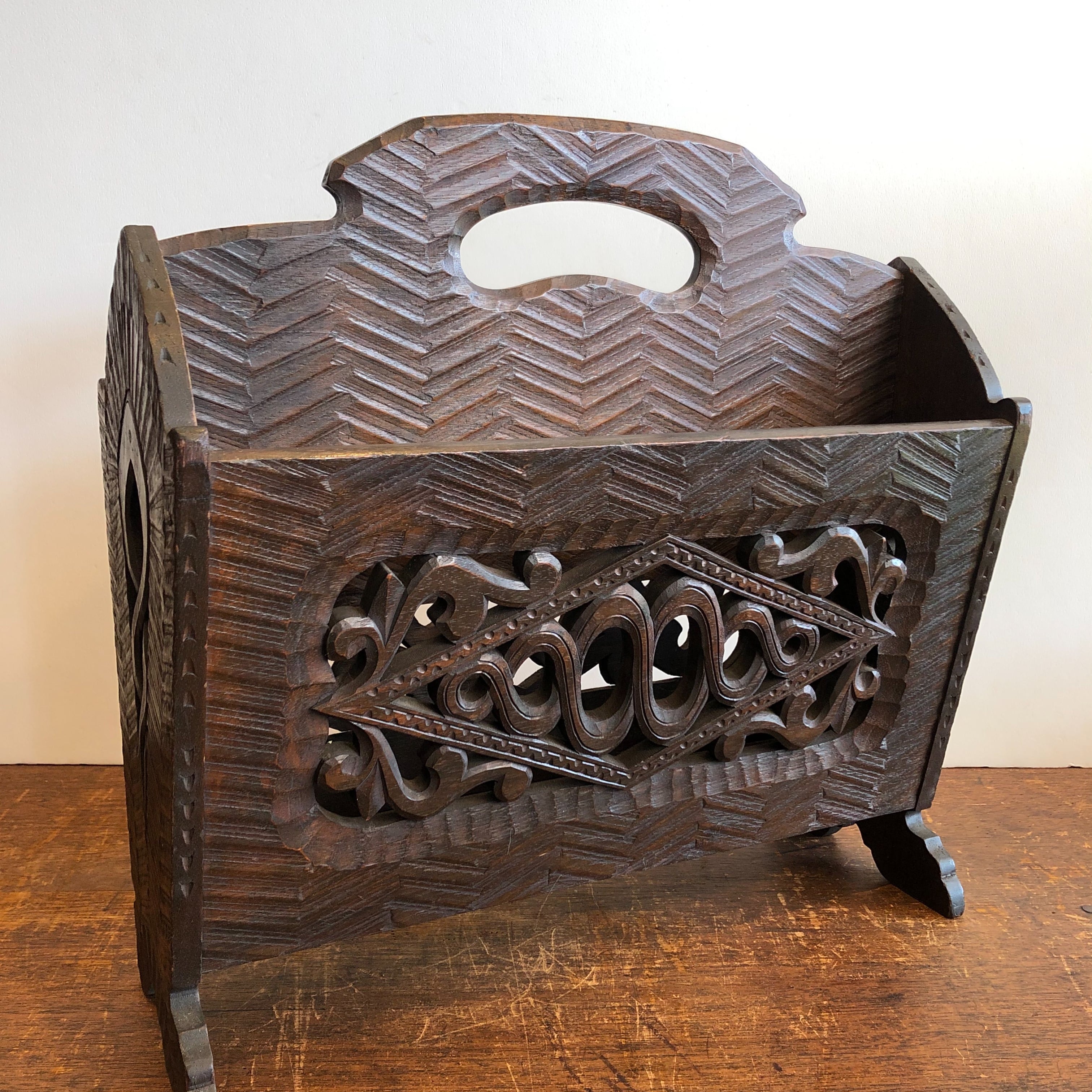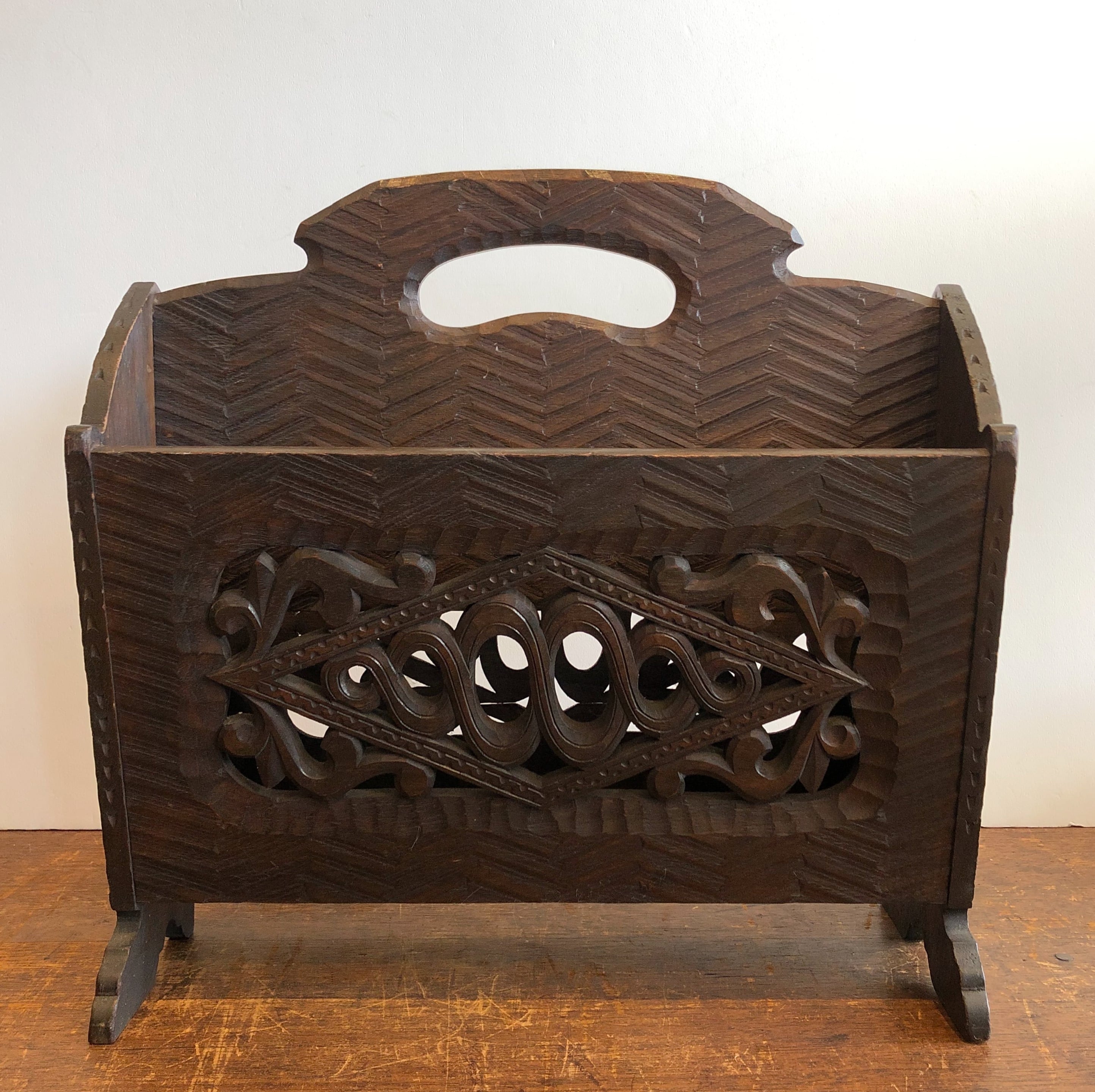 持ち手や側面まで美しく木彫りされたヴィンテージマガジンラック。