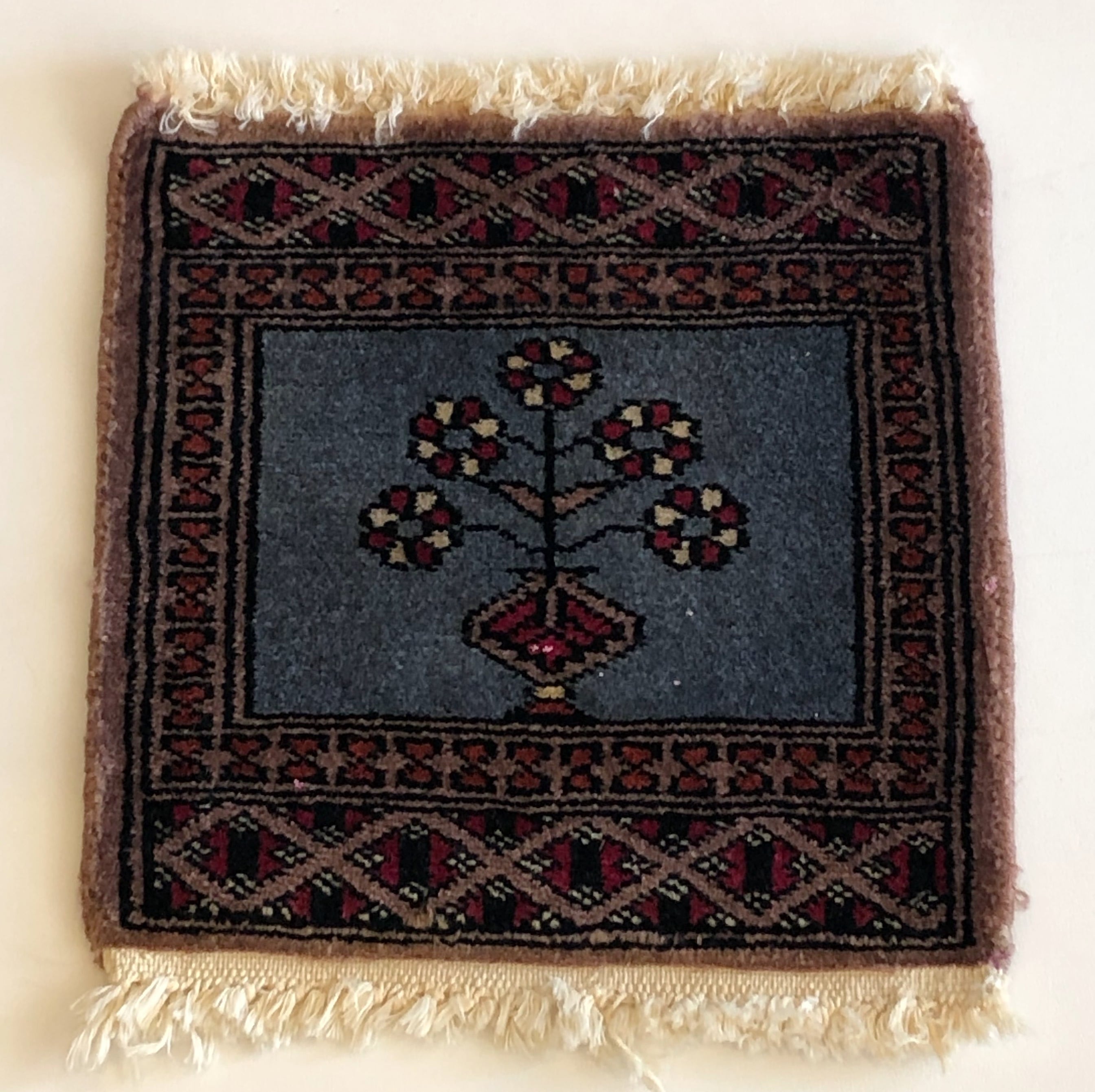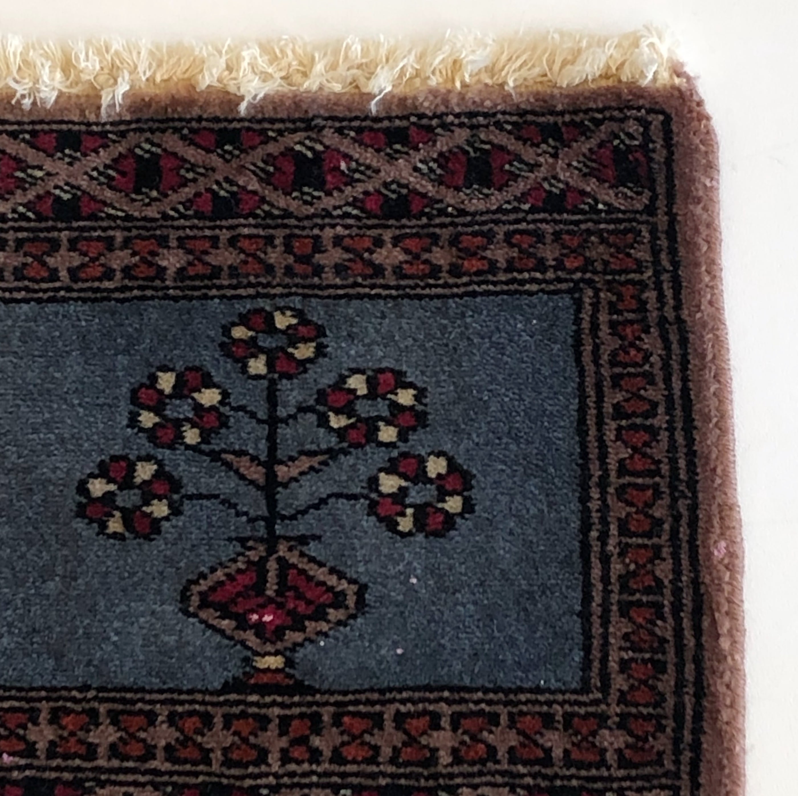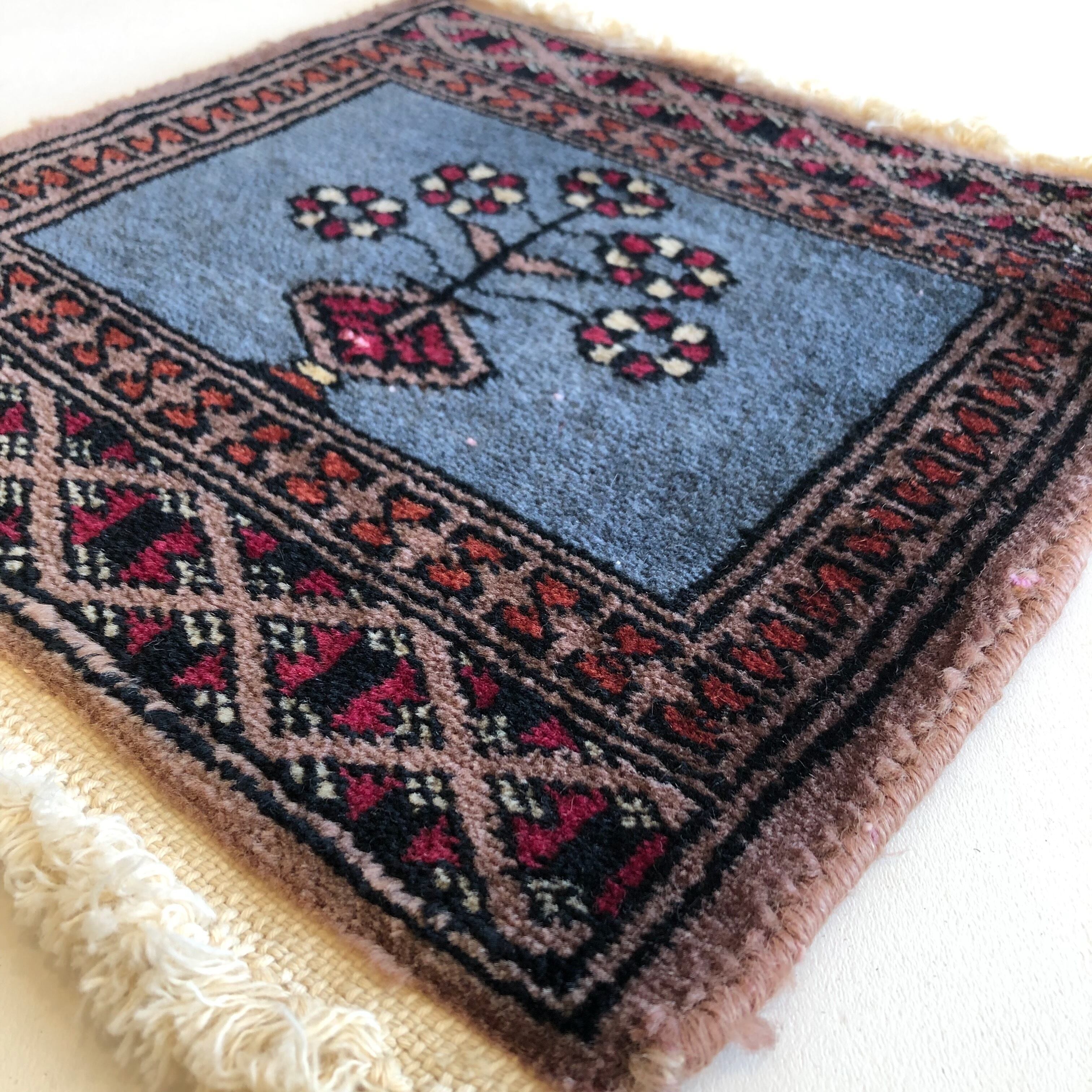 赤系が多いミニラグの中で目を引く、ブルー地が美しい一枚です。
